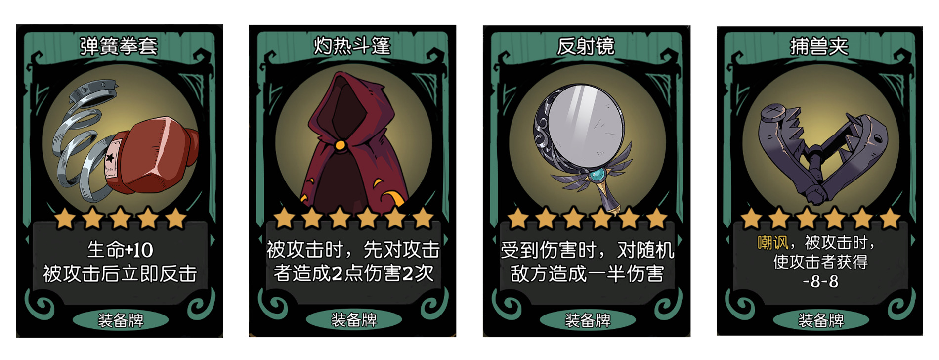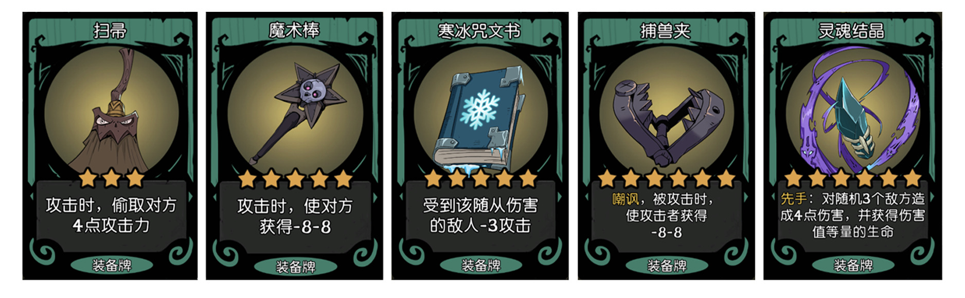 这几个装备都有不同程度的削身材效果,这边要特别说两个,寒冰咒文书,可以给法强类随从佩戴,例如充能炮、碳水蝙蝠这种,或者是小石精,石精巨兽这类,效果拔群。捕兽夹可以用来防止对面杀手鱼人的攻击,使得杀手鱼人想杀的人因为杀手鱼人被-8攻击力而杀不掉。