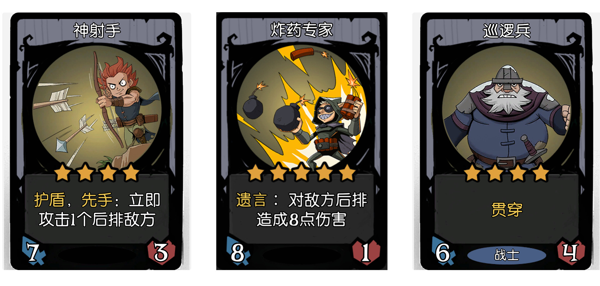 - 巡逻兵,全游戏唯一贯穿哥,贯穿效果是同时攻打同列随从,那很明显就是可以打到后排的。