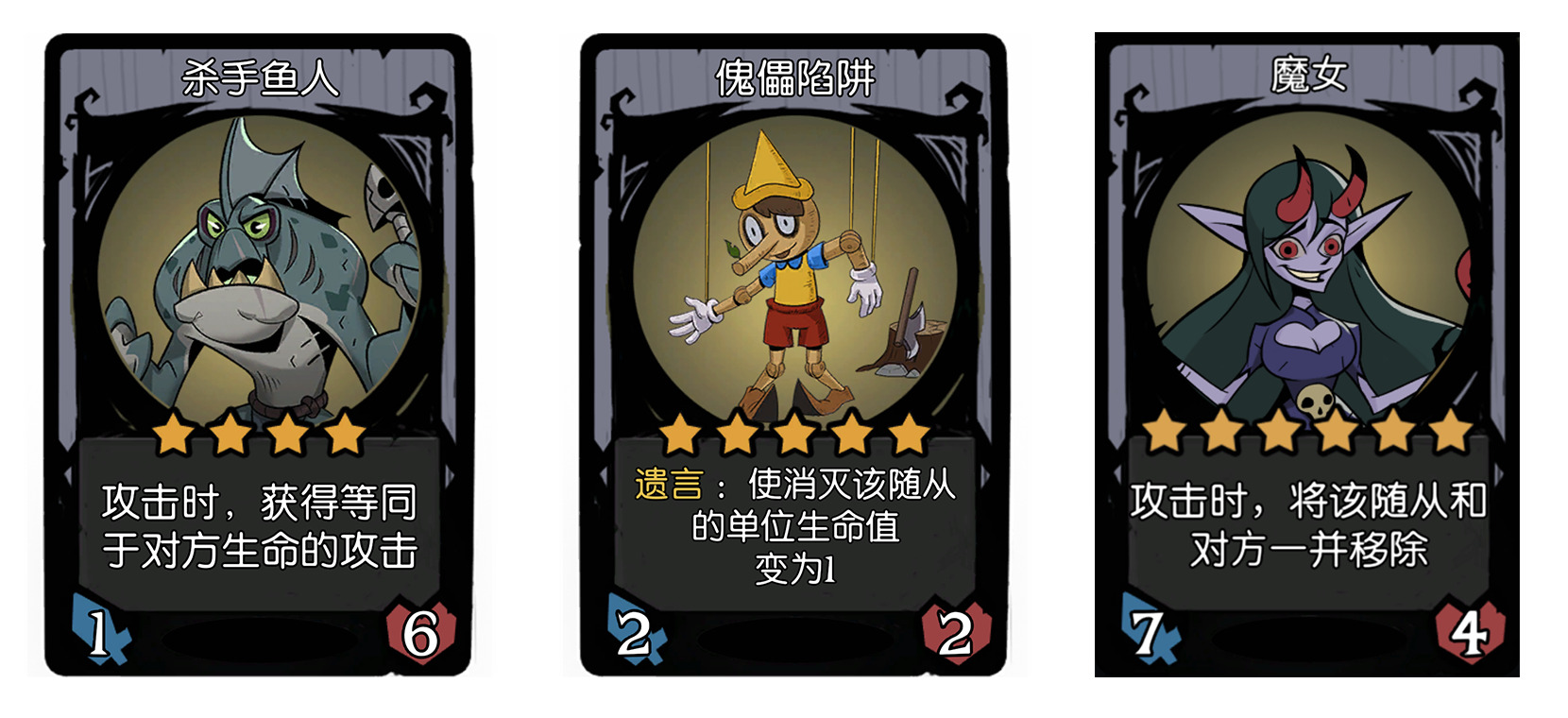 - 杀手鱼人和魔女,用法差不多,因为都是攻击时获得,所以你得保证是你自己动,而不是被动挨打。到决赛时,要是真打不过对面的电话号码阵容,一般都会配合装备:护盾和弹簧拳套,套在套娃里用。这边要注意的是,杀手鱼人打上去是要先破盾的,你可以配合5本装备袖箭,攻击时先破盾,再打对方,对方若是遗言随从,其遗言还是会触发。魔女则不同,她是直接移除,移除的话,就什么都不用管了,遗言也不会触发,两张卡牌一起消失。
