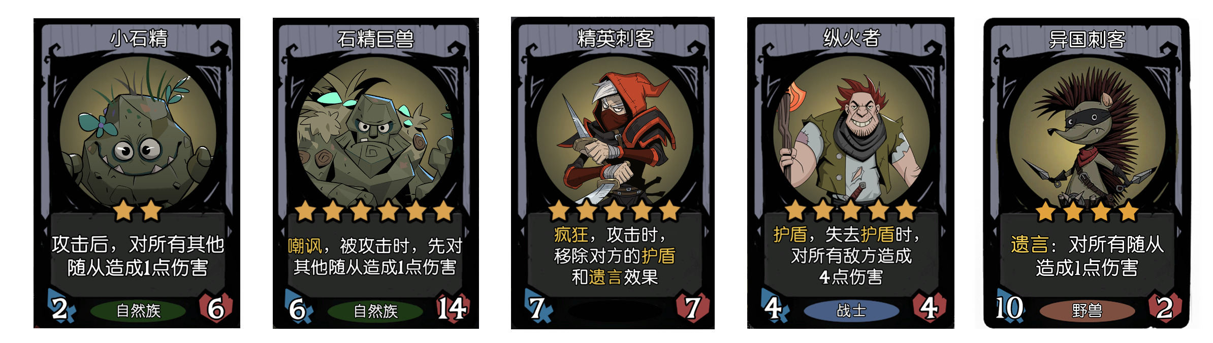 - 小石精、石精巨兽、异国刺客这三张牌一样,都是对所有随从造成伤害,他们仨,也会破自己的盾,如果你想破对面盾的话,要想清楚。