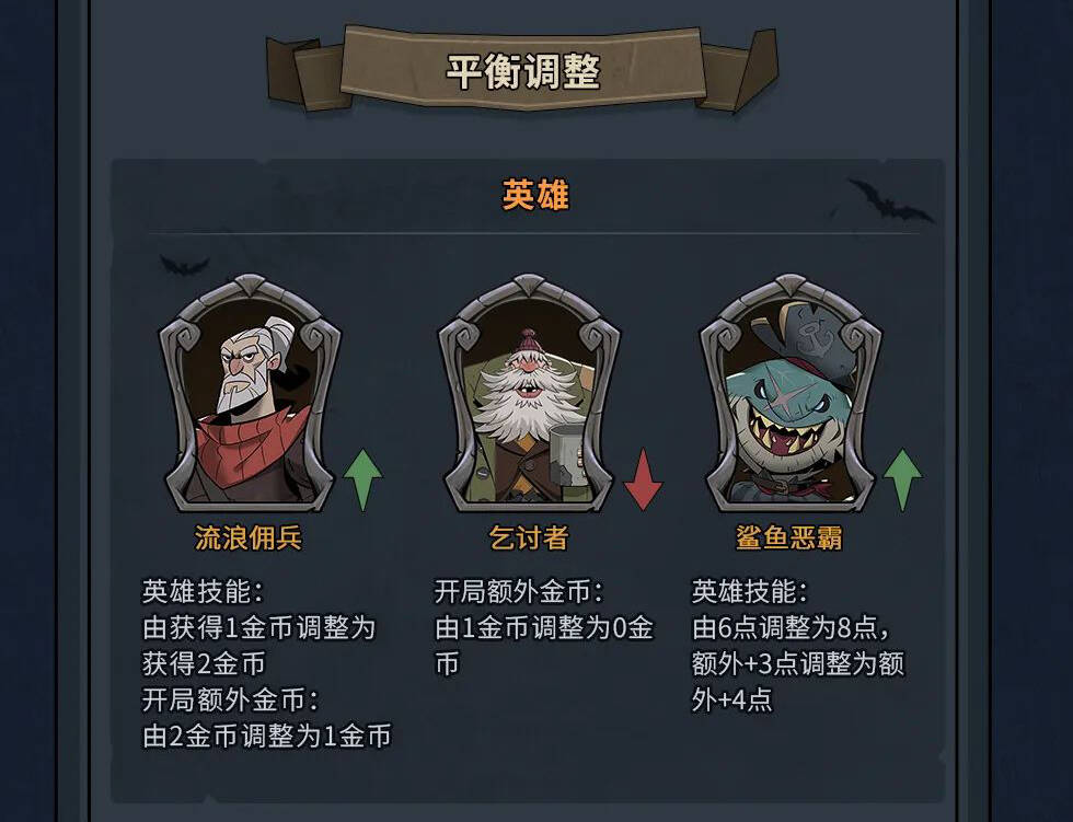 - 英雄调整这边,首先是流浪佣兵,这个英雄原本选的人不是很多,这次改动过后,让他拿中立随从直接就是0元购了,那么1本窃贼就是血赚,2本鉴赏家、厨师更不用说,只要运气好,这个英雄能无敌感觉。经济直接拉满!经济英雄谁不爱!