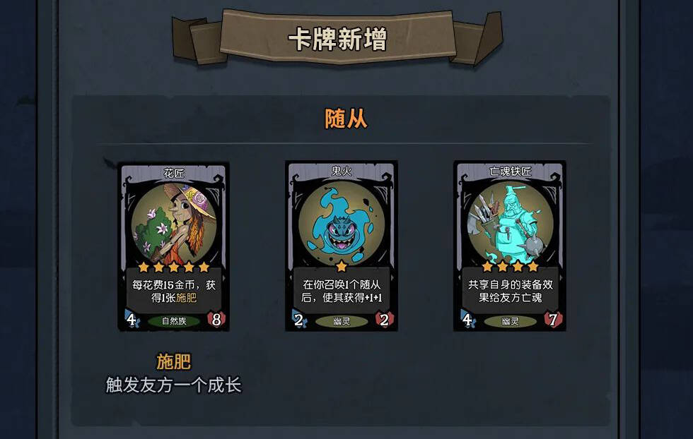- 1本鬼火替换掉了原来的无头行者,鬼火的卡牌描述是召唤一个随从,使其获得+1+1(注意是召唤的随从获得+1+1不是鬼火获得+1+1),感觉作用不是很大吧,不过毕竟是1本的卡牌,也没啥好说的。