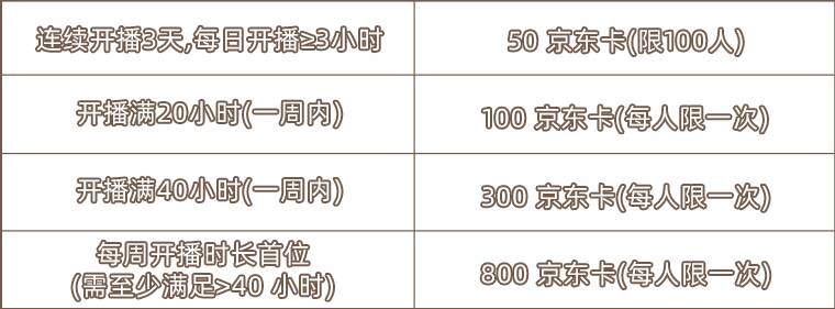 2、累播扶持:在月圆之夜分区开播,每周直播满20、40小时后可在月圆之夜主播招募群(QQ群号:915069765) 额外申请领取京东卡奖励。