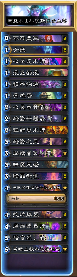 乐队经理精英牛头人酋长4费牛,神卡,我牛里带的1费群体沉默(去掉快攻的buff加成,过掉嘲讽斩杀等等)2费血誓(主要应对法师脱罪<没有橙卡也能玩,就是打法师面对脱罪没法应对,只能看前期能不能斩杀了>,也能叠甲防被斩杀)9费红龙(打后期卡组能精准打脸8血挺重要的)