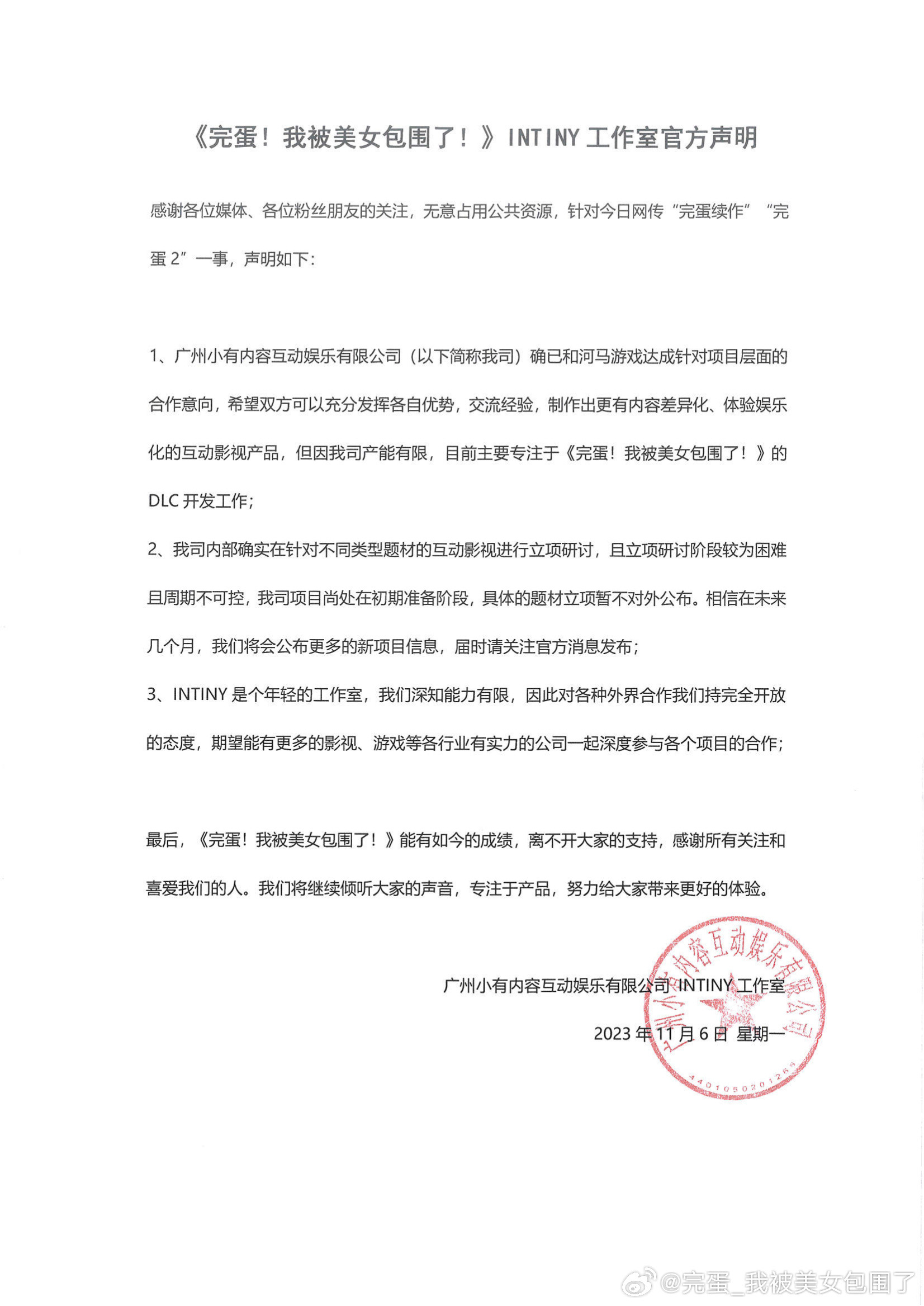 11月6日,针对网上流传的《完蛋!我被美女包围了!》续作《完蛋2!我被帅哥包围了!》的传闻,开发商INTINY工作室官方进行了回应声明,官方表示他们已与河马游戏达成针对项目层面的合作意向,但由于产能有限,目前主要还是专注于《完蛋!我被美女包围了!》DLC的开发工作。