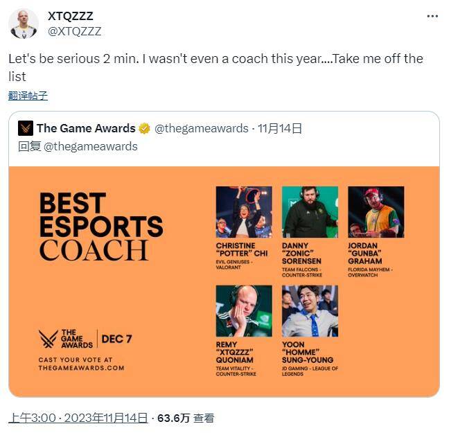 Vitality战队的现任教练XTQZZZ在推特上对自己被提名TGA年度最佳电竞教练感到十分诧异,因为今年他甚至都不是教练,虽然Vitality战队在今年的BLAST.tv巴黎特锦赛上夺冠,但当时Vitality的教练是ZONIC。
