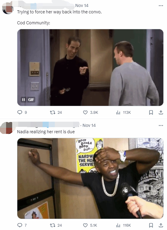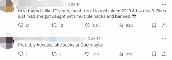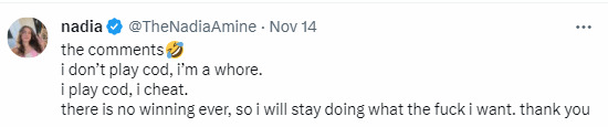 然而,Nadia并没有回避这些攻击,她转发了骂她的推文并表示:“我不玩COD,你们说我是xx 。我玩COD,你们说我开挂。反正无论如何你们也不满意,所以我会继续做我想做的,谢谢。”