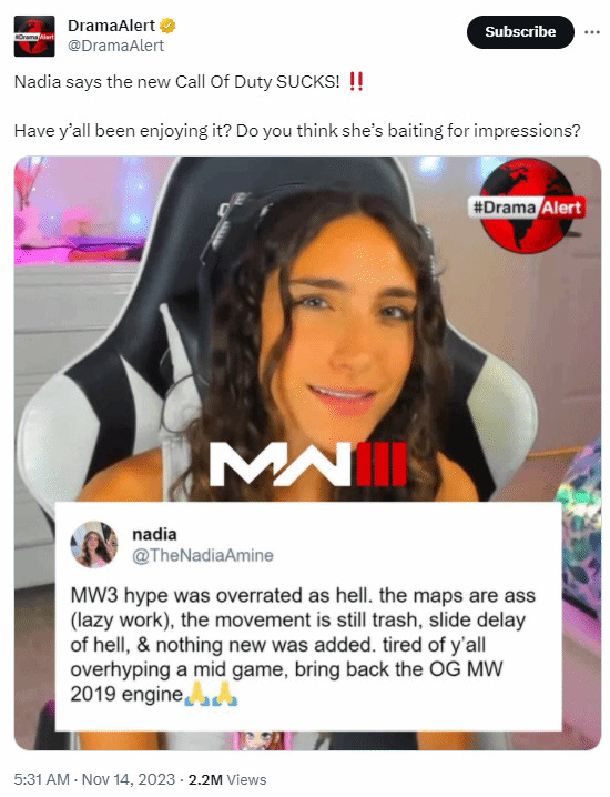 近期,国外《战区》女主播Nadia在推特上发文吐槽《使命召唤20:现代战争3》,称这款游戏“被高估了”、“动作垃圾”并且“没有添加任何新内容”。