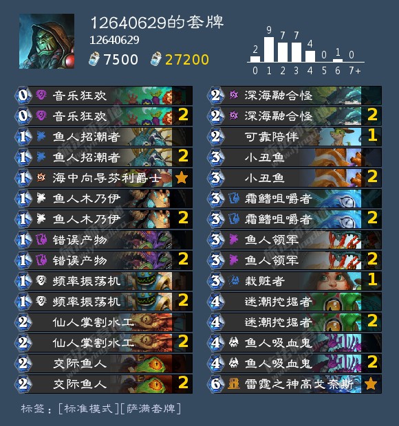 10星鱼人萨亚服两天上传,本质是套快攻卡组,222新鱼人过音乐狂欢/可靠陪伴补牌站场,121减费机械,4个融合,323元素鱼人铺场,领军加攻打脸。