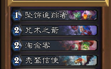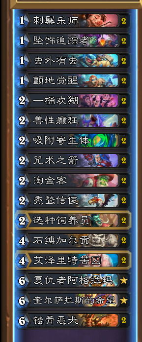 其实就是营地那一套,具体的大家可以参考营地昨天的标准日报。我自己没有做改动的原因很简单,这套牌能够改动的不多,比如刺鬃乐师、咒术之箭、淘金客等等可以换成其他更舒服的过牌。那么接下来我会拆分一下卡组,从而解释我们在对局当中应该注意的问题和细节。