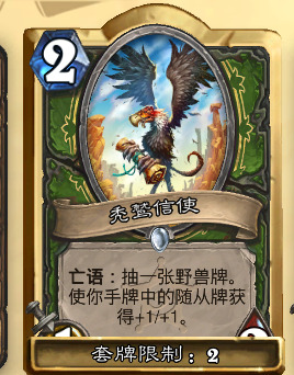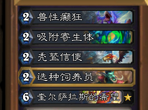这张新卡的加入绝对是重要的拼图,2费的低消耗、加buff和定向检索野兽的出色效果让一局对战中,你秃鹫来的早不早成为了关键。因此这里我强烈推荐各位饲养员去选秃鹫而不是狂战,因为狂战的需求只有一张,就算buff没有加到狂战也能压缩牌库。但每加一次buff就能让我们的斩杀提高(配合寄生体)1-6点这是非常夸张的.我们整个对局依赖的主要buff就是秃鹫。秃鹫下的越早,buff越快,狂战上手越快,那么你在6-7费这个对于当下很多卡组至关重要的回合就能抢得先机,不管是配合站场还是恶犬的回血,都能给予很大的容错。而癫狂我的建议是大家尽量在后手去打,配合自己的场面使用,而不是只加手牌,很多时候场面的加攻能够调整对面的血量,让对手猝不及防。
