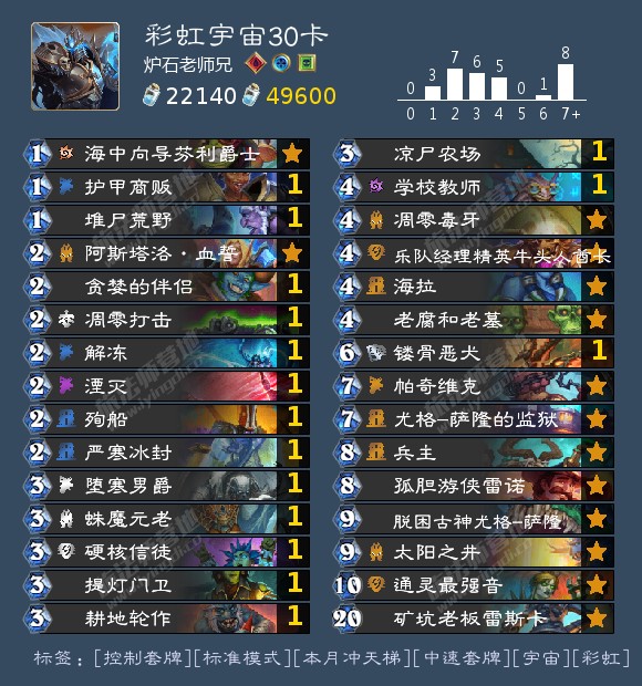已上传说30宇宙彩虹dk,还是那句话,非主流卡组,需要熟练度,上分合成谨慎,不喜勿喷。牛里蒸汽机器人,蛇软,公爵,新版本新卡几乎都是多种颜色的,很适**虹,dk虽然官推挖掘体系,但是dk的挖掘太亏节奏,在这个圣骑士4费秒人,德鲁伊你4费他7费,一地嘲讽龙的情况下,没有挖掘的活路,雷诺才是王道。卡组代码先拿出来,具体攻略我回头用pc编辑下,大家先看看。