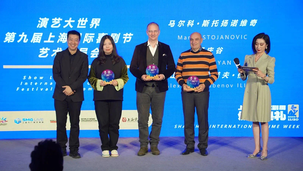 默剧周收官之际,演艺大世界·2023第九届上海国际喜剧节高峰论坛11月20日下午在朵云书院举行。当晚,国际默剧文化交流周颁奖典礼举行,参加工作坊的学员现场进行了汇报演出,并获颁结业证书。默剧协会马尔科•斯托扬诺维奇将极具代表性的“哑剧手套”授予中国京剧表演艺术家严庆谷、默剧与形体教授亚历山大•卢本诺夫•伊利耶夫。这一立名为“金手”奖的奖项,旨在感谢艺术家长期以来在舞台表演中的杰出表现以及对默剧行业做出的卓越贡献。