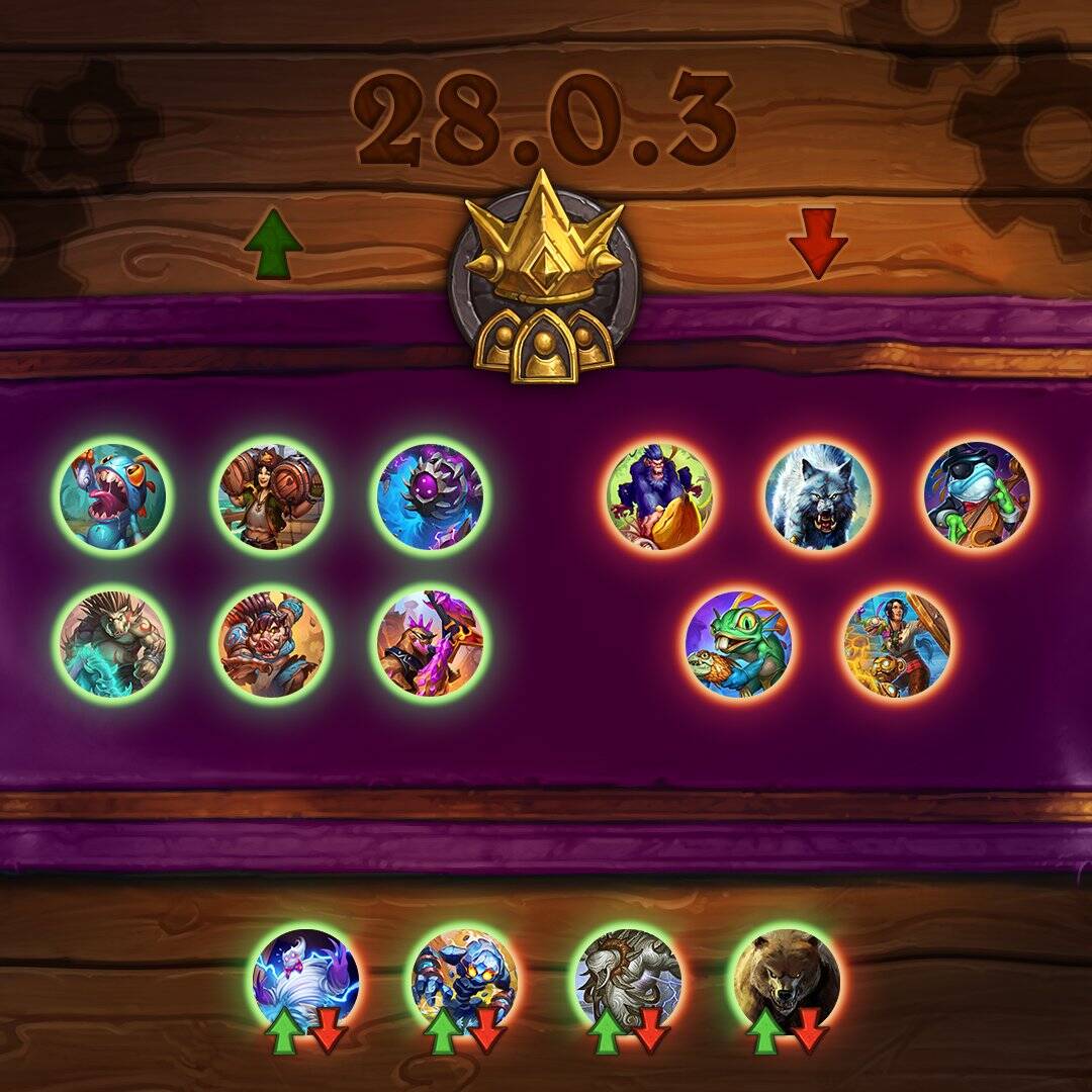 新版本上线第二周,荒芜之地的第一个正式平衡补丁如期而至。按照惯例,炉石官推今夜先行发布构筑和战棋的调整名单图示。