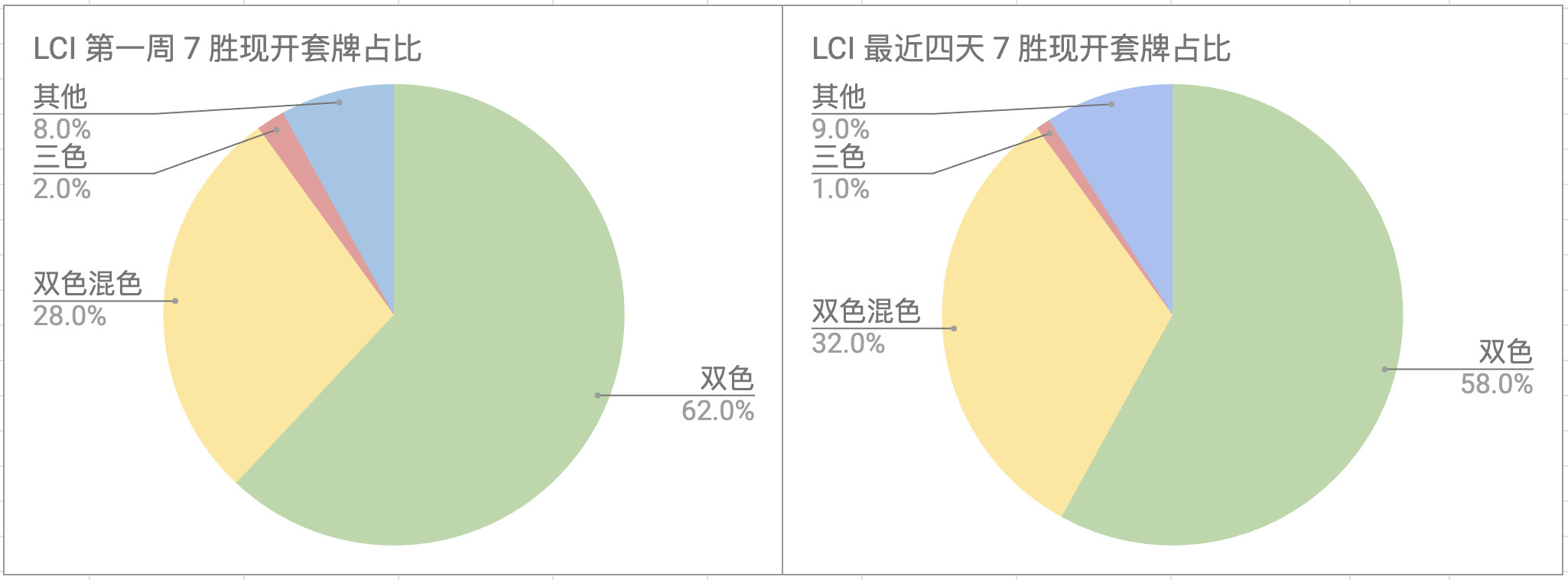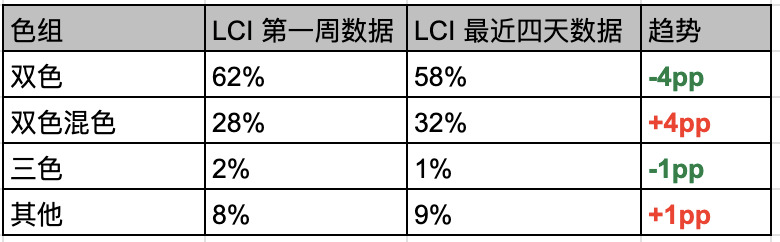 在我们对于 LCI 第一周的数据分析中看到纯双色、双色混、纯三色的占比大致是 6:3:1,而平均胜率上也是:纯双色 > 双色混 > 均三色。