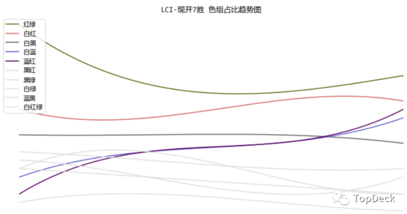 所有 7 胜套牌的构成中,红绿、红白最多,稳居前两位。蓝色的强度随着时间推移,被越来越多玩家发现。所以蓝红、蓝白的 7 胜套牌有了大幅增加。