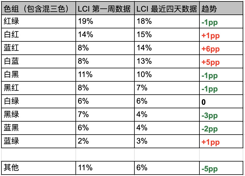 这次我们看了一下 7 胜套牌的构成占比,与套牌分布基本一致,双色、双色混 6:3 开,均三色不是好选择。从时间趋势上,最近四天比 LCI 上线的第一周混色高胜套牌的占比略有提升,28% -> 32%。
