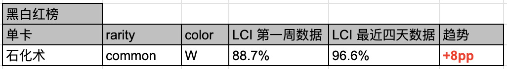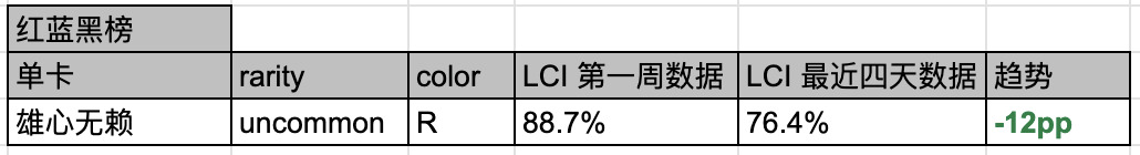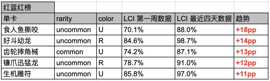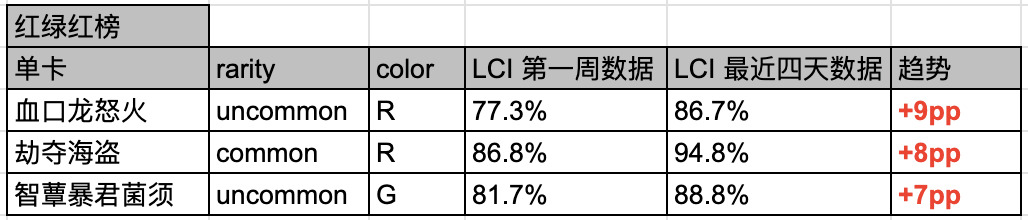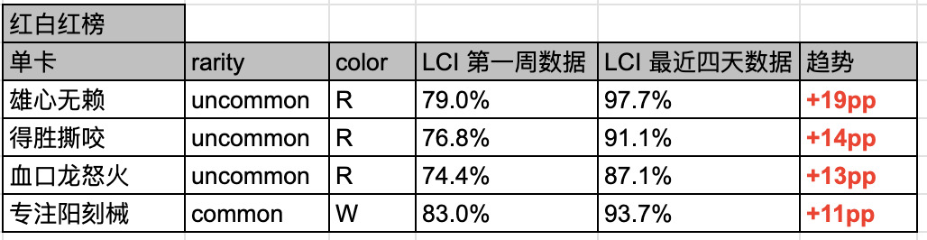 例如:我们发现 血口龙怒火 这张 Trick 在红绿色组中,最初的使用率是 77.3%,但是最近四天已经增长到了 86.7%。这表明这张牌是一张好牌,且比大家最开始认知的「更好」。如果是相反的数据,则表明可能「没那么好」。