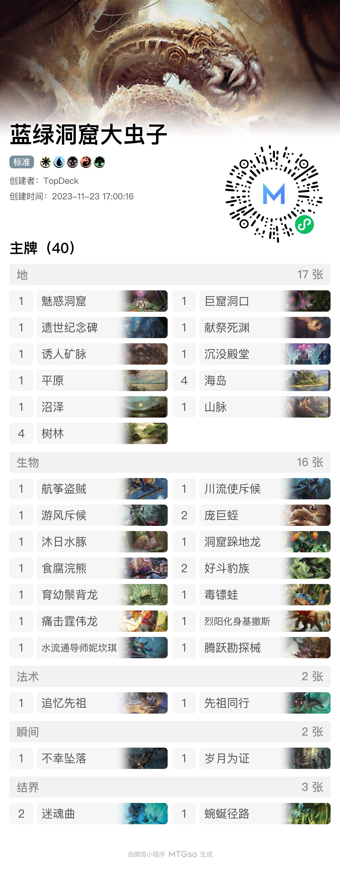 蓝绿底色套牌,**三色大恐龙。非常有趣的是套牌使用了六张洞窟,所以还**了两张 庞巨蛭 。最终战绩 7-2。