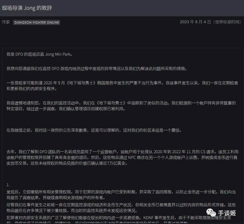 今年的8月份,《地下城与勇士》国际服同样爆出过非法获利的事件(不是初犯),只不过国际服出现问题是因为“滥用职权”。《地下城与勇士》国际服由韩国官方来进行运营,按照官方的说法,滥用职权的行为是被内部的安全系统检查出来的,安全系统一直在升级,却在2022年11月才检测出问题,而涉案员工早就在2020年就开始监守自盗了,3年后才被查出来。