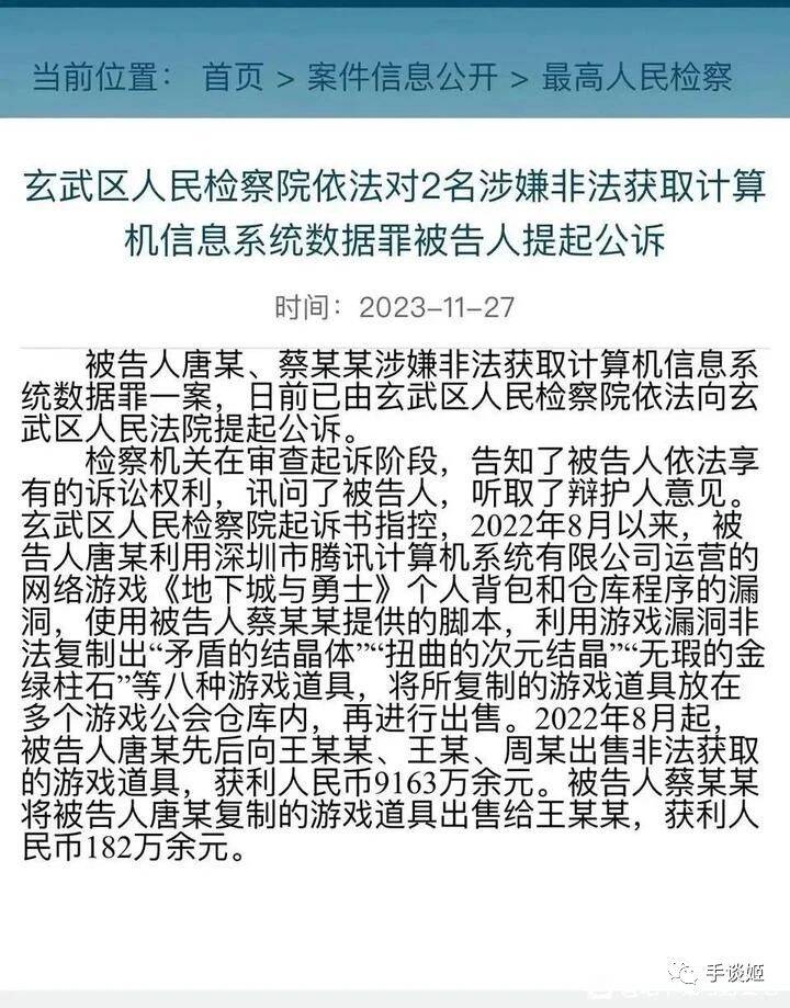 11月27日下午,根据南京市玄武区人民检察院公开的信息,检察院对两名犯罪嫌疑人提起公诉,被告人利用《地下城与勇士》bug非法复制游戏道具进行出售,非法获利9000余万元。该公告目前被隐藏。