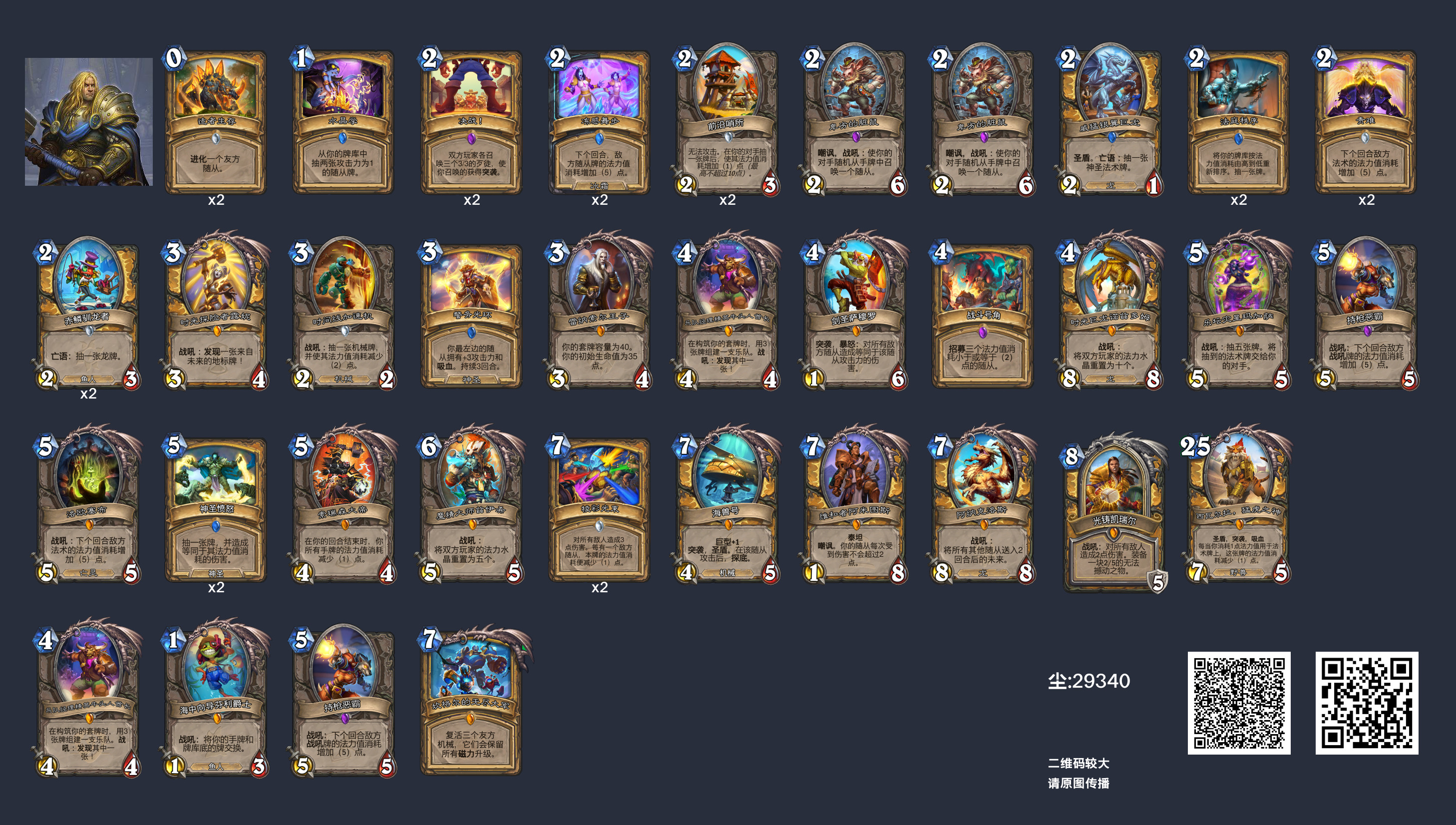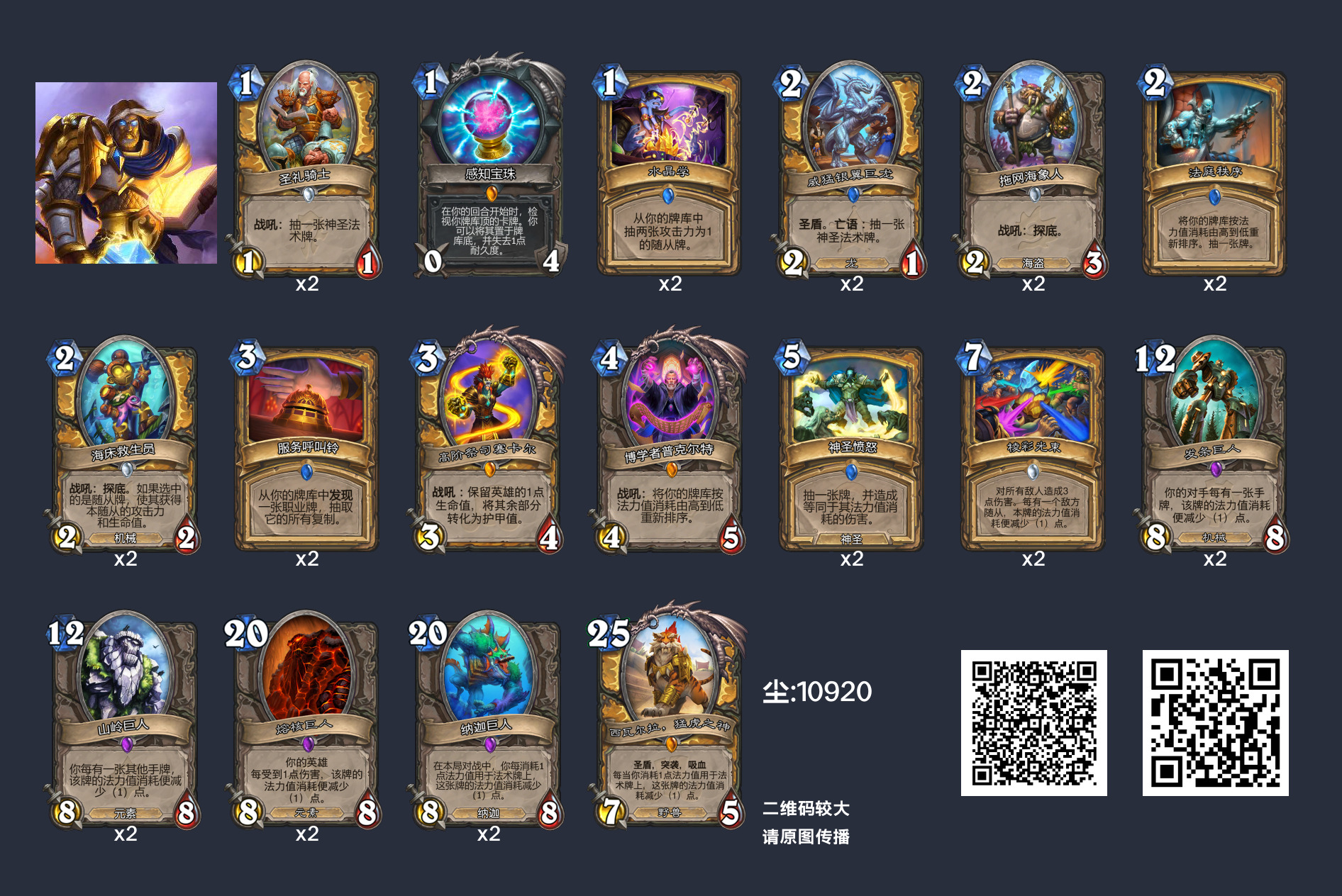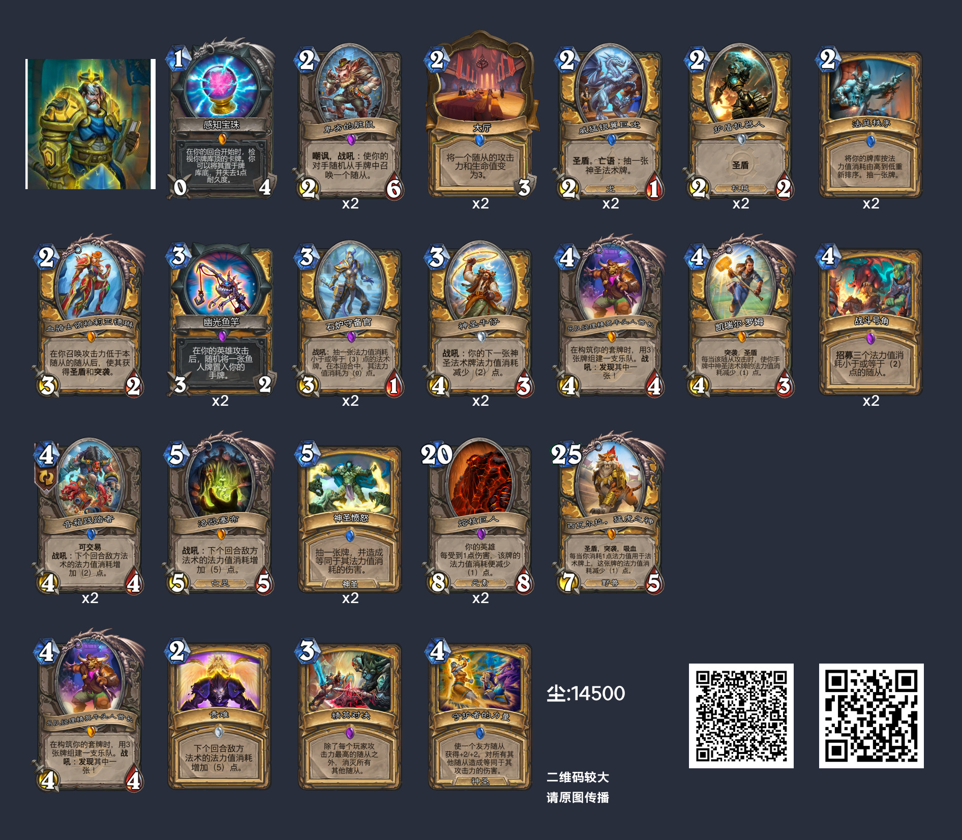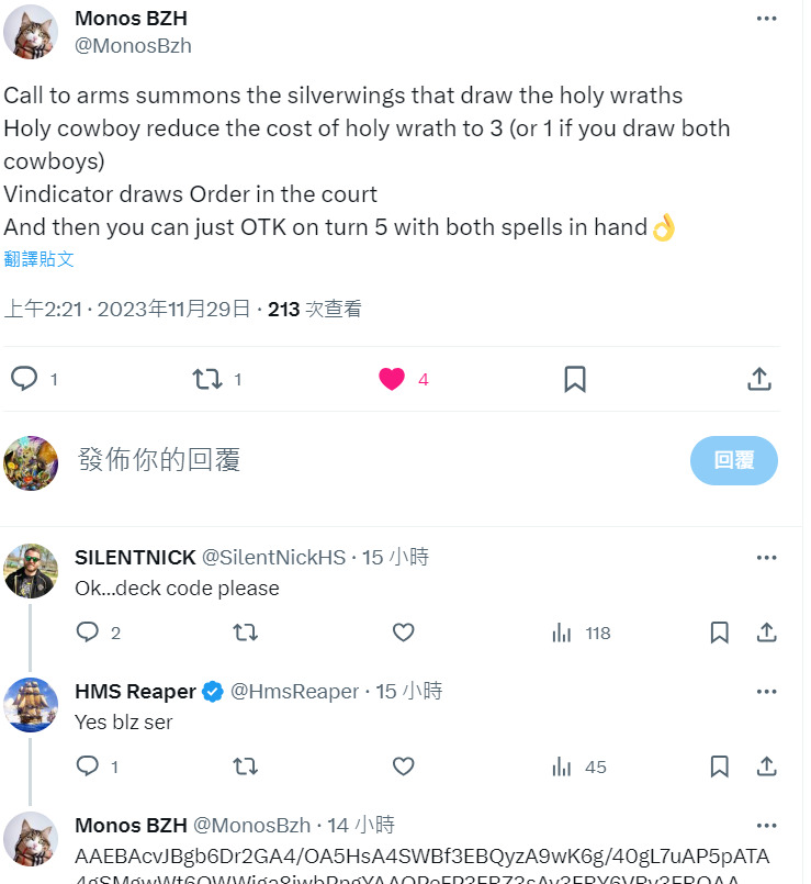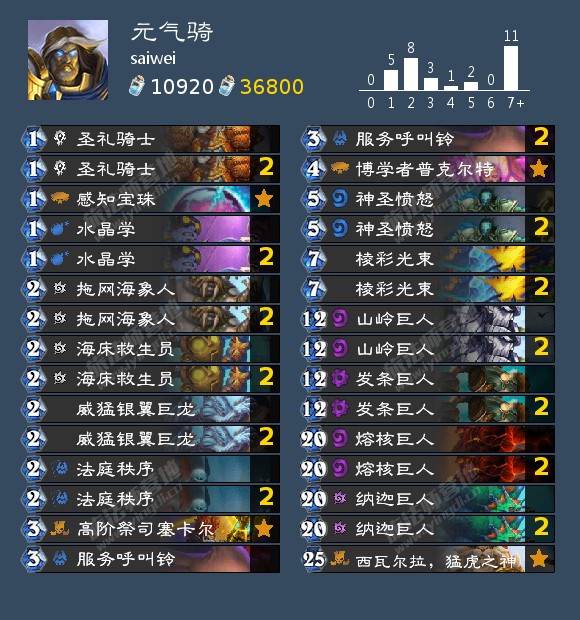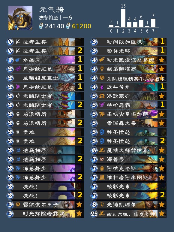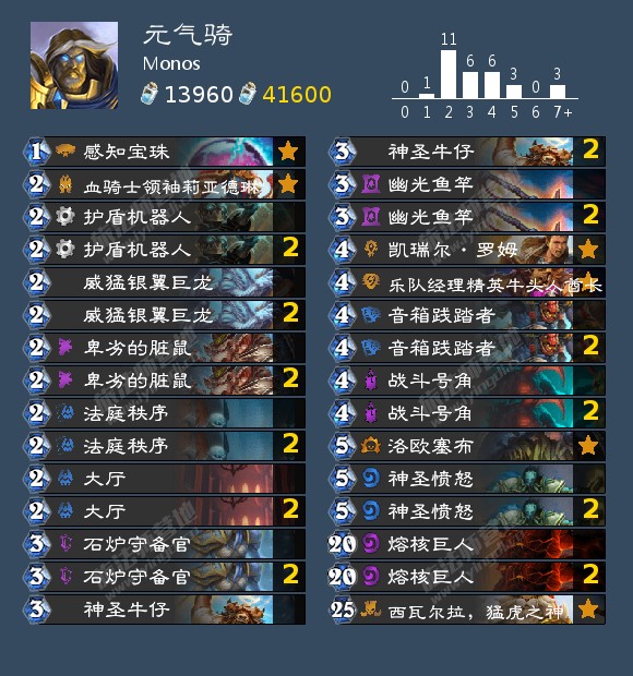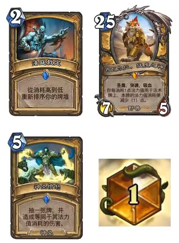 战斗号角召唤威猛银翼巨龙 ,抽取神圣愤怒。神圣牛仔将神圣愤怒的法力消耗降低至3(如果你抽到两个牛仔,则为1)。石炉守备官抽取法庭秩序。然后你可以在第5回合拥有两个法术的情况下进行OTK。