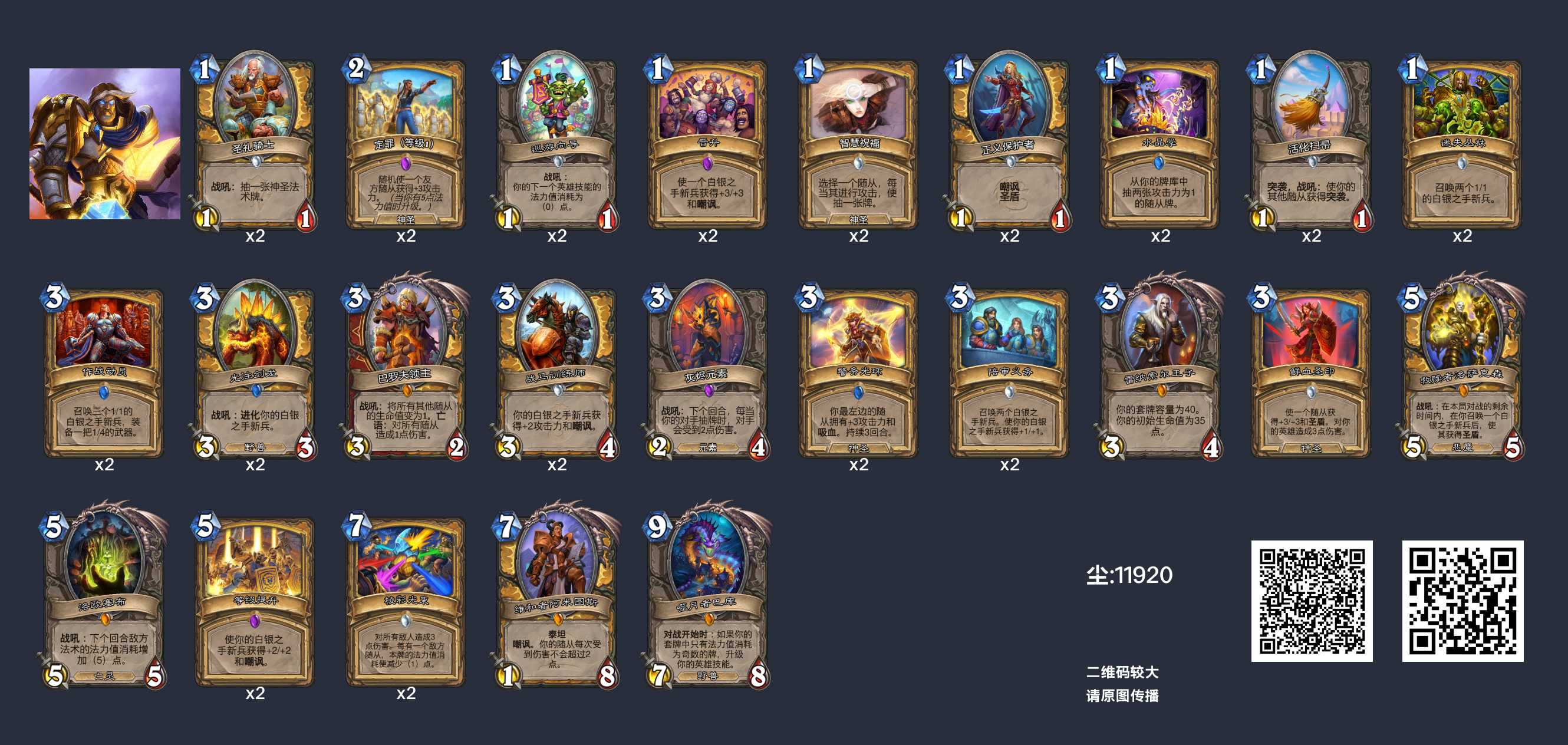 警务光环:遇到萨满,贼,牧师起手找警务光环,这是我们转守为攻的关键,警务光环在我们以防守为主的对局中(如偶数萨,剑鱼贼中)最好在四费再挂,前三回合我们尽量去拿场面,场面失手也不用担心,我们六费可以用3+2+1(技能+陪审义务/作战动员+活化扫帚)的返场和回血,而这个往往是我们奠定胜局的手段。在面对快攻暗牧时,活下来!活下来!活下来!三费警务,四费3+1可以基本完成清场回血。