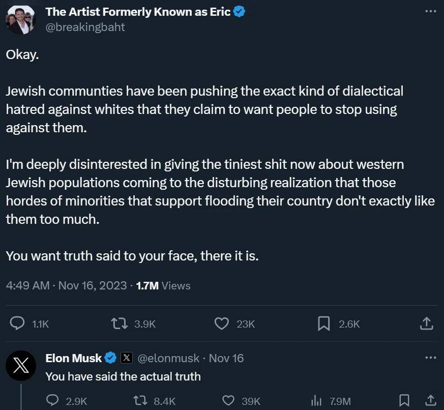 一名X用户发布了一段推文,指出“西方犹太社区对白人有一种辩证的仇恨,但他们却不允许别人对他们保有相同的敌意”等针对犹太社区的批评。在巴以战事还在持续的当下,这个说法与当前西方主流舆论方向相悖,毫无疑问是会被划为反犹太主义的一段话。