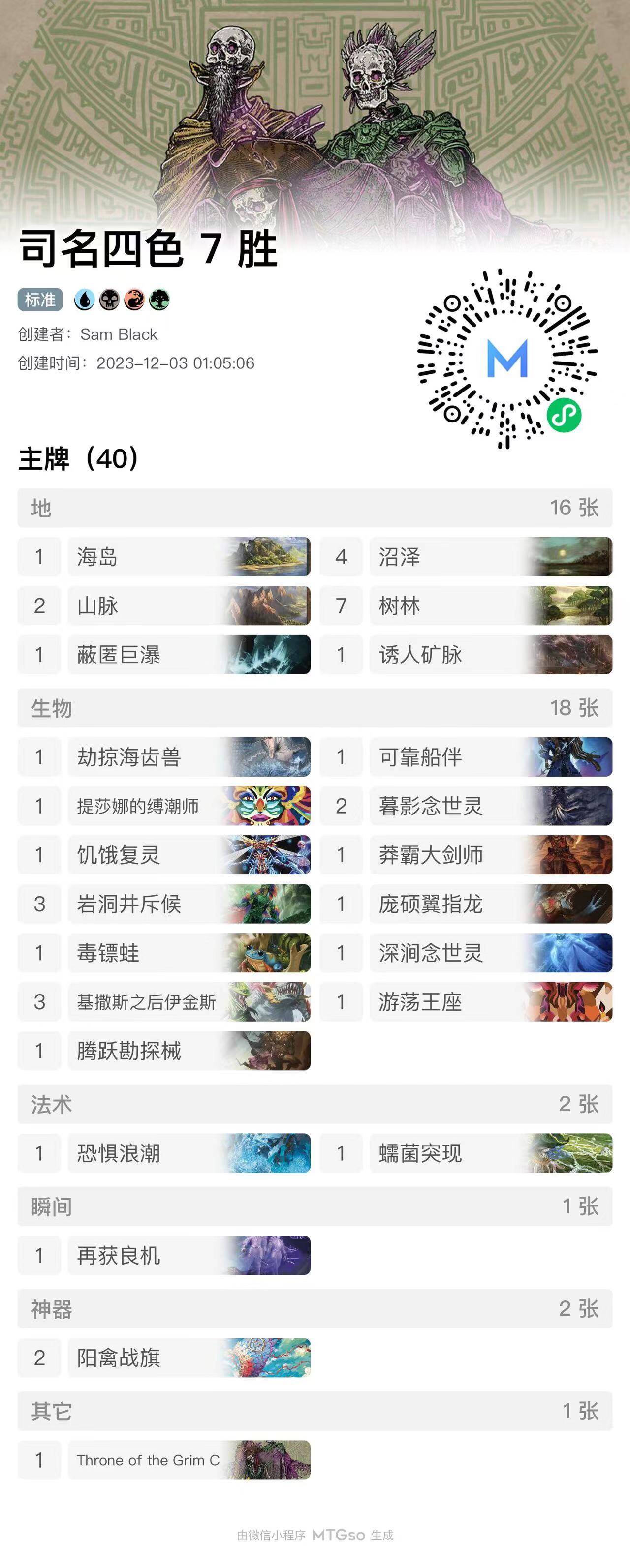 最终 Sam Black 操控这套以司命为核心的四色轮抓套牌从天梯 Mythic 46 位开始,取得了 7-1 的成绩。在 TopDeck 的 B 站账号下,有轮抓和全部八盘对战过程。