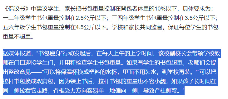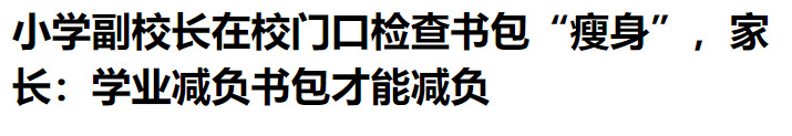 而就在前两天,这股风潮陡然猛反。南方一学校大搞书包瘦身减负,严格到小学生上学要在学校前给书包称重。