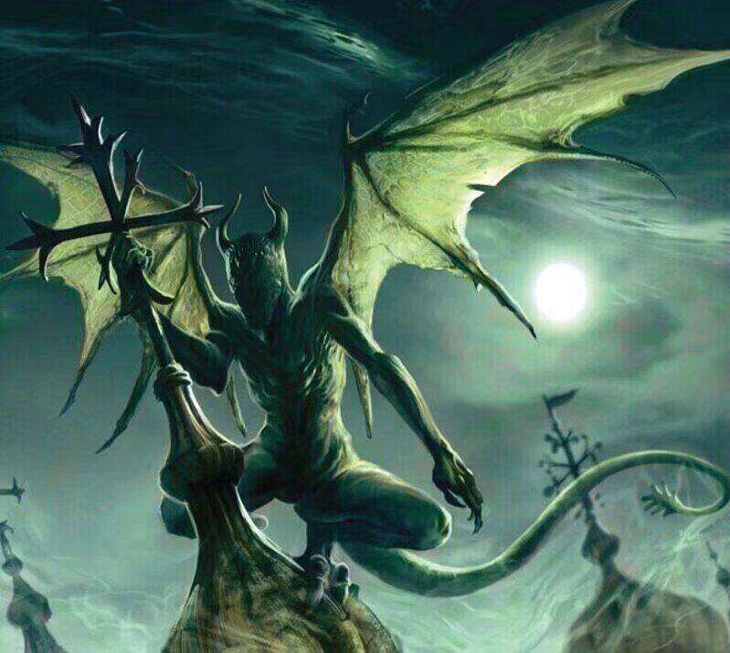 “它们**鲸鱼般光洁油滑的外皮,一对讨厌的犄角向内对弯着,蝙蝠般的翅膀拍打起来毫无声响,还有丑陋但却颇为适合抓摄物件的爪子,以及毫无意义地甩来甩去、让人心烦意乱的倒刺尾巴。但最让人感觉厌恶的是它们从不说话,也不大笑;它们从不会露出任何笑容,因为它们根本就没有用来微笑的脸,在那本该是脸的地方,它们只有一片象征性的空白。”