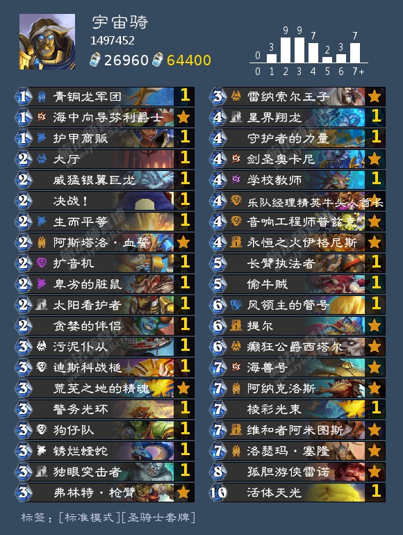 书接上回,尽管月初在顶分段趁着随从类多系法构筑尚未彻底完善时偷鸡成功,但补丁前整体的欧服前百天梯环境对于偏慢的宇宙奶骑来讲简直是炼狱。劣开多系法大劣挖宝法导致整个游戏过程充满折磨。。尤其是在经过两波真爱永恒警告以后我排名更是喷到了200开外,所以基本上进入了躺平等补丁状态。客观来讲,法师的造物削弱一费最大的影响就是没办法准时管住光铸骑和快攻骑布吉舞乐的节奏,这直接导致补丁前已经初露峥嵘的馆长舞虫光铸构筑和一直零星分布的快攻花园骑在补丁当天爆炸式增长。而这一情况间接导致若干职业在顶分段被打到查无此人(比如看见布吉舞乐和决战光束就两眼一黑的纳迦瞎)。所以对于奶骑来讲,环境进入了一个极其微妙的情况。。那就是环境里绝大部分主流都能打一打,但对局时长非常的不受控制(经典赢一把30min,输一把几分钟)。。所以属于是玩游戏体验尚可,上分体验依旧极差的卡组。现在这套构筑感觉韧性还是可以,补丁当天一路从300打到37,但芬利,法庭,偷牛贼这几个单卡还是见仁见智。打光铸找到雷诺,打病dk早点触发精魄会大幅度提高胜率,否则光铸体感是个45比55的微差劣势,病dk是个46开小劣势。打宇宙血dk和宇宙萨就比较拼内力,但总体会是一个无压力开出777就轮到对面头疼的对局。体感优势但依旧折磨。比较奇特的对局情况是打德。。实际打下来,会发现对面一旦没胡死,比较早的交出了雷诺和10费刀的话,777精魄由于有明显的疲劳优势和身材优势,对抗单龙巢是完全不惧怕的。。反而7费地标是最大风险,如果雷诺吃到了地标就很安心。至于烟火德,欧服前面我只遇到yuan在玩。。基本就是看对方启动前能不能破坏组件了。。瞎子今天只遇到了突袭的快攻瞎,总体处理好对方的325以后场面压力会小很多。总体思路来讲的话,打快攻就是控场挨打,等决战光束/守护者/泰坦/消失龙等节奏开始反打,打中慢速需要利用2345曲线,尤其是四费的剑圣,牛牛和音响工程师去抢到节奏或者是对铺同时完成对精魄的检索,然后利用翻倍后精魄卡的高质量去拖干对面资源.