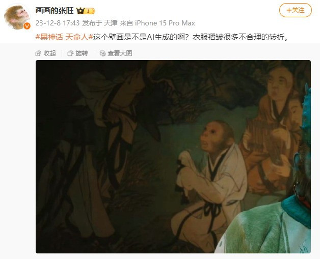 之前在TGA2023颁奖典礼上,《黑神话:悟空》新预告片发布,本作将于2024年8月20日发售,登陆PS5、XSX|S和PC。许多人注意到预告片开头出现了一副“悟空学艺”的壁画,有人认为该壁画里人物衣服褶皱有很多不合理转折,并质疑其是AI生成的。