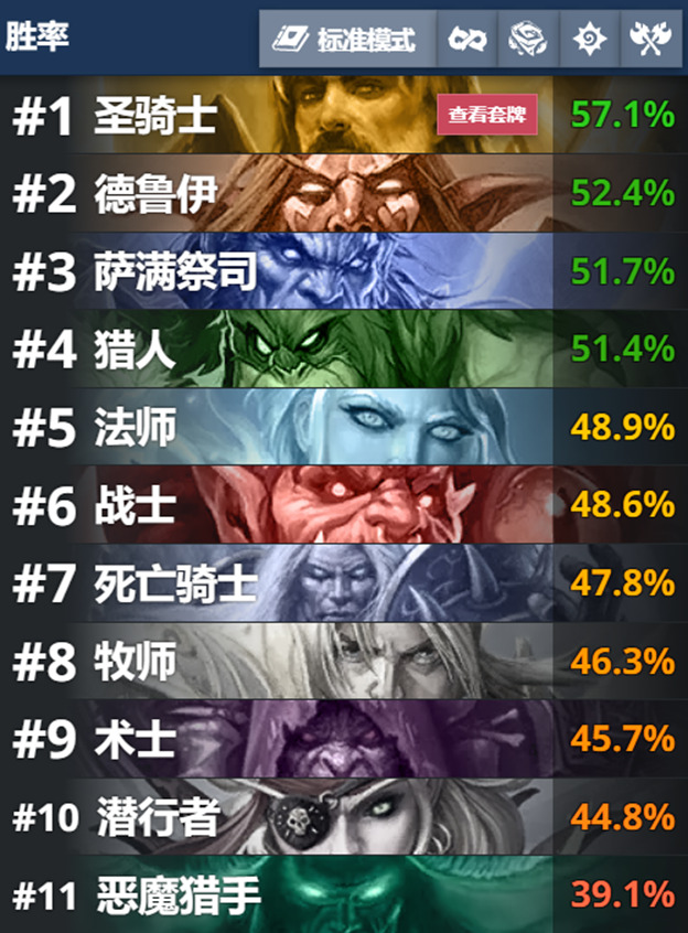 当下这个环境,更像是花园骑,宇宙萨,(半)宇宙龙德之间在玩三国演义,所幸除猎人和术士外,剩余的九个职业都能掏出足够有代表性的卡组。
