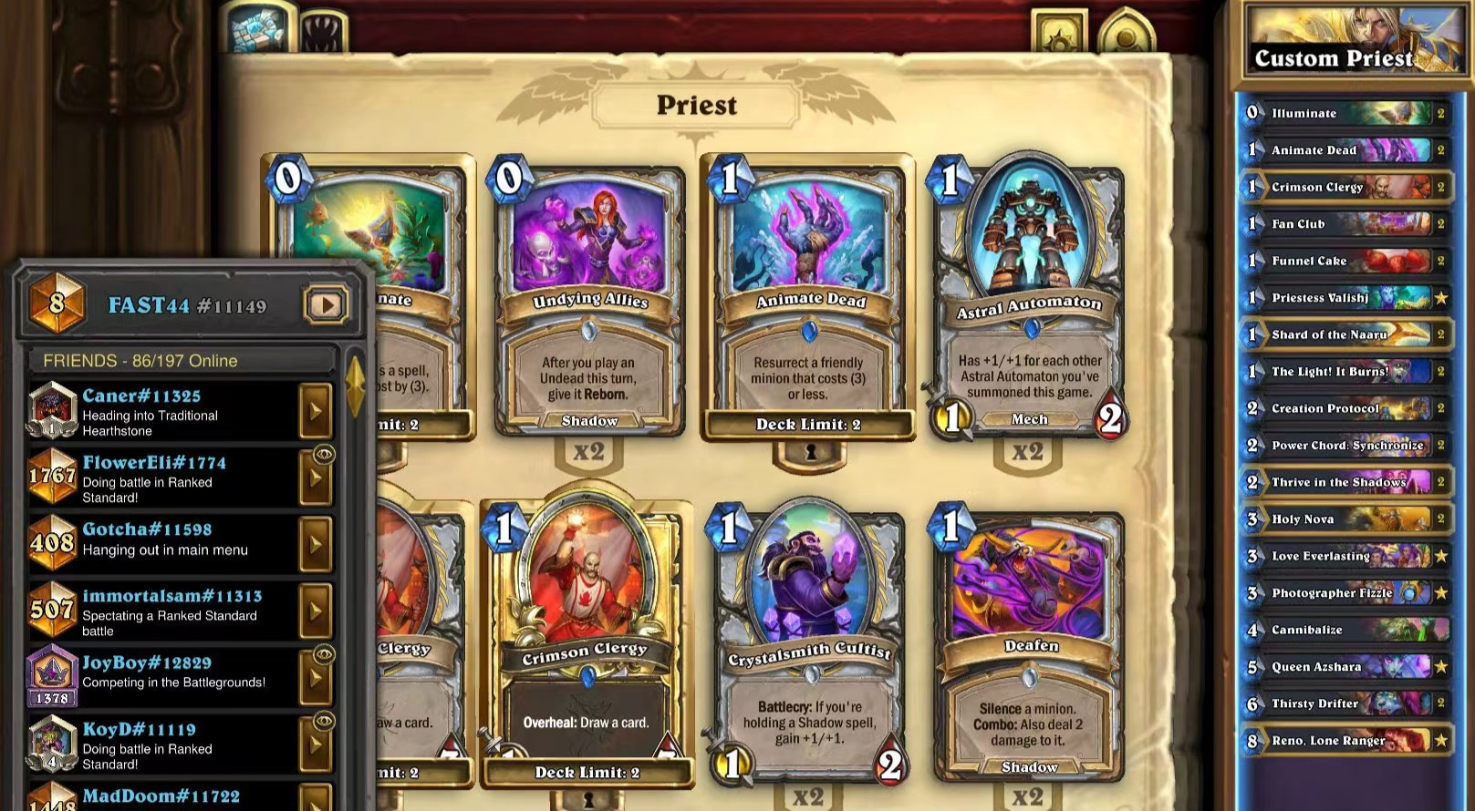- 内部数据卡组: 宇宙DK、疫病DK、纳迦瞎、快攻纳迦瞎、半宇宙德、烟火德、龙德、半宇宙猎、发掘多系法、多系法、光铸骑、Buff骑、宇宙骑、无限牧、纳迦牧、宇宙牧、奇迹贼、宇宙萨、自然萨、控制术、半宇宙战