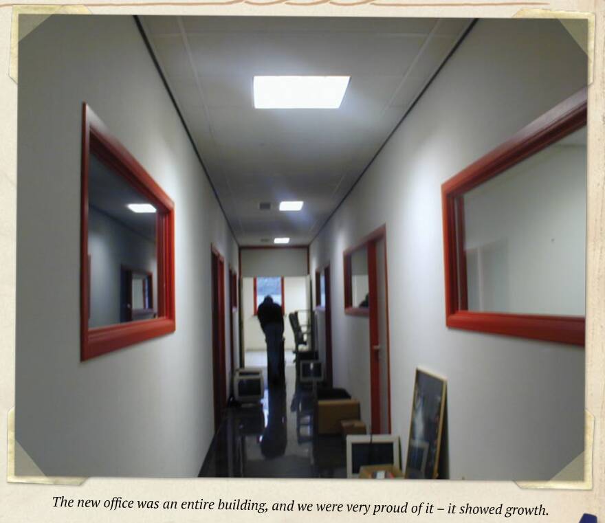 实际上在游戏开发早期阶段,CDV对拉瑞安的支持还算不错,斯温说他们拿到投资之后干的第一件事就是搬迁,换一间新的办公室,并购置一些体面的硬件,别的不说,起码这一整栋楼比原来那个老破小的电器商店要好太多了。
