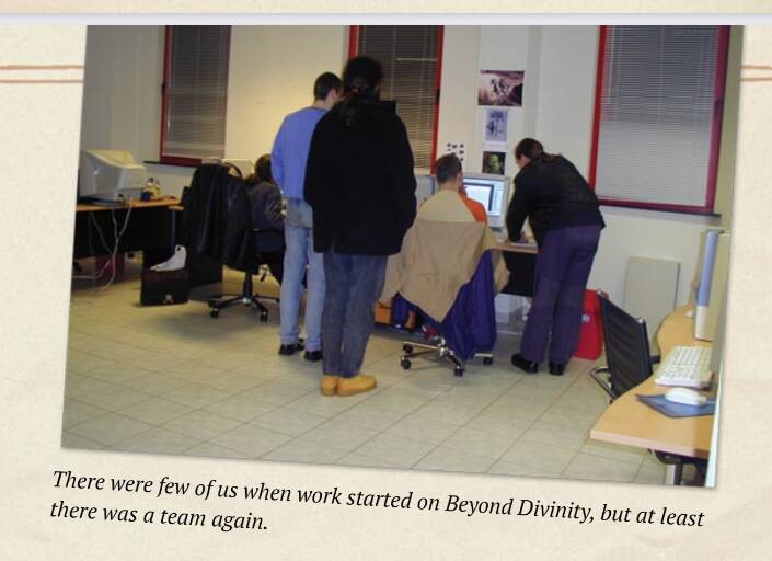 2005到2006年之间,完成了《超越神界》的拉瑞安组建了一支小型团队,他们制作了《神界2》的早期版本,并把游戏截图贴在墙上,这些图片时刻提醒着整个团队:我们最后真的会把这款游戏做出来。