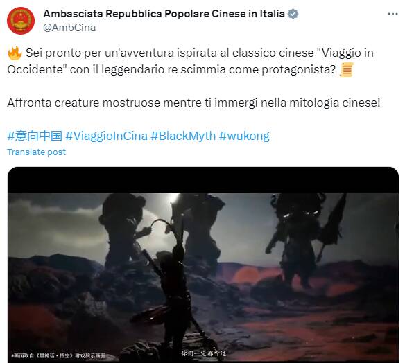之前在TGA2023颁奖典礼上《黑神话:悟空》新预告公布,游戏将于2024年8月20日发售。近日中国驻意大利大使馆在推特上发文,强烈推荐这款作品。