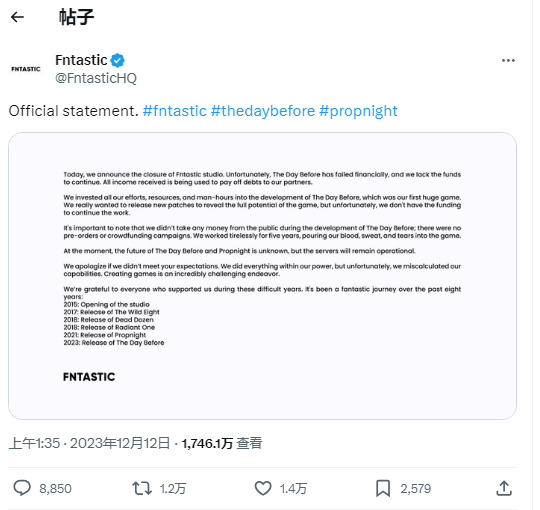 12 月 12 日消息,《浩劫前夕》是由 Fntastic 创作的开放世界生存游戏,于 12 月 7 日正式发行。由于这款游戏的广泛差评,Fntastic 工作室宣布关闭。