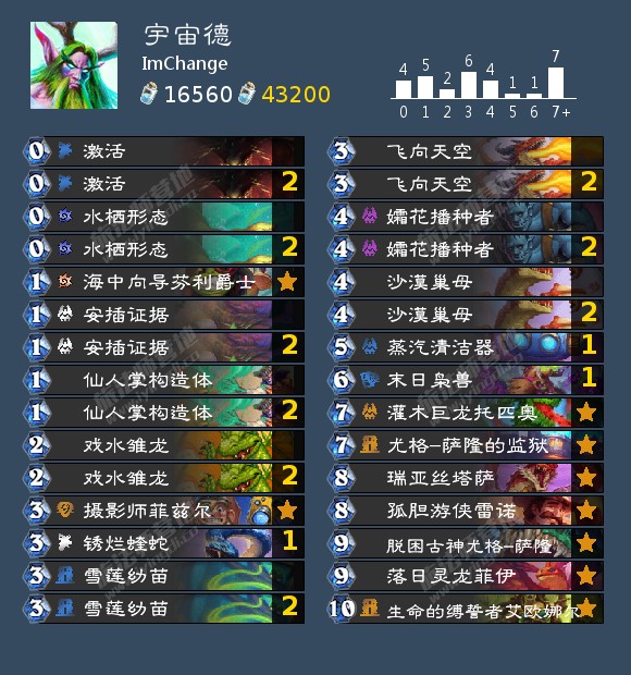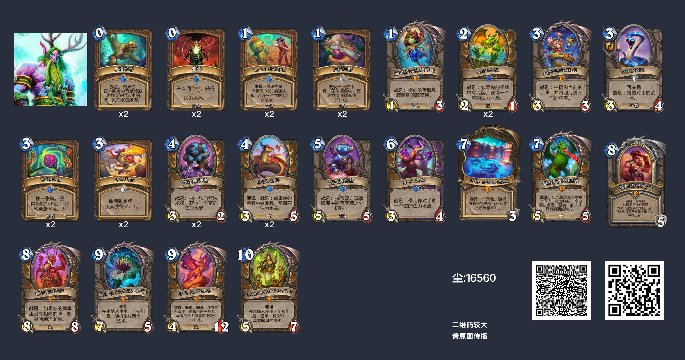 前期尽量留跳费组件和飞向天空,这些重复的牌都可以考虑起手留,卡组中期很容易就宇宙,强势点就在于大概率前期能跳费稳住节奏,过渡到中期化身宇宙形态强无敌,内战拍宇宙的两张卡。高分段专门为了打疫病dk加了一张蒸汽机,如果环境没疫病的话就换成545花园抽高费。这个卡组重复的牌大部分都可以起手留,且相互有检索手段,相互配合中期就能宇宙。