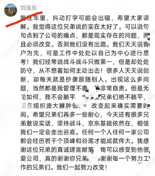 在小作文里,他主动背锅,说因为自己 “ 管理不善 ” ,让现阶段的京东 “ 组织庞大、臃肿低效 ” 。