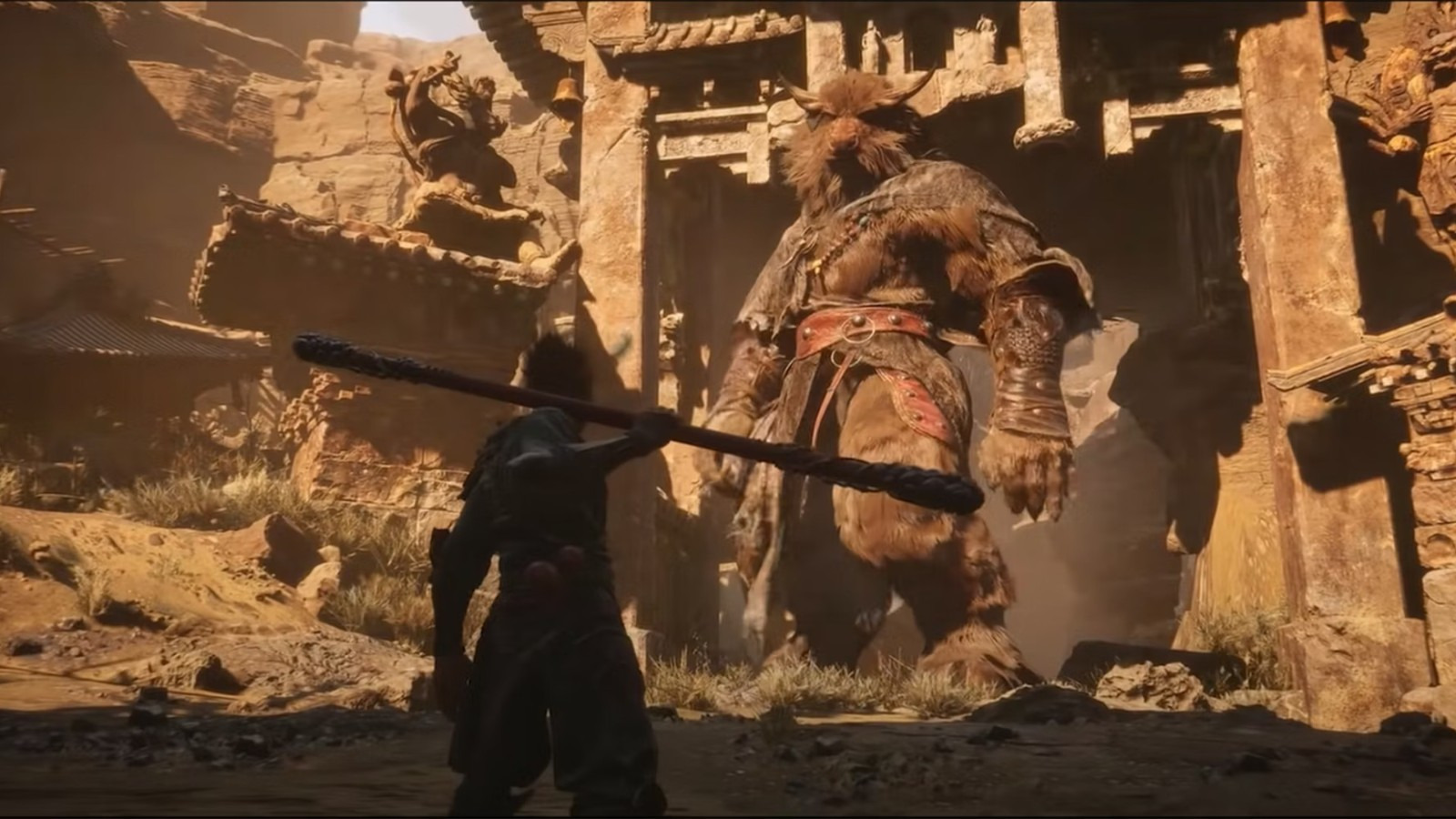 《黑神话:悟空》的艺术设计汲取了中国古老神话艺术作品的灵感,尤其是佛教绘画的灵感,展现了西游记及其佛教信息对游戏视觉效果的影响。此外还经常出现比真人更大的怪兽,比如山一样高的巨龙,头顶云层的巨人,可骑乘的巨大昆虫。这些怪兽体积远远超过其他魂类游戏中的生物,让人不禁想起《旺达与巨像》中的巨人。