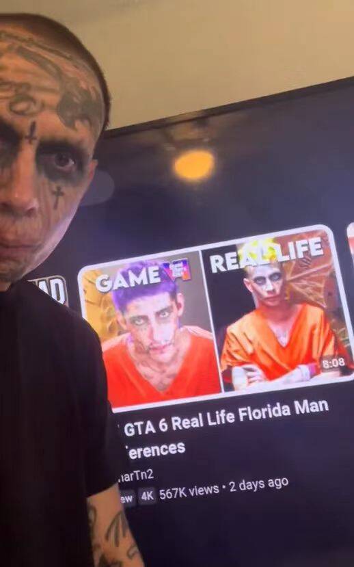 在第一篇视频中,沙利文将手机镜头对准自己的脸以充分展示纹身,指出GTA6预告片中那个被捕的小丑和自己的造型相仿。“你们知道他们的灵感来自于谁。我!只要查一下我:佛罗里达小丑,迈阿密小丑,你们就知道我在说什么。”