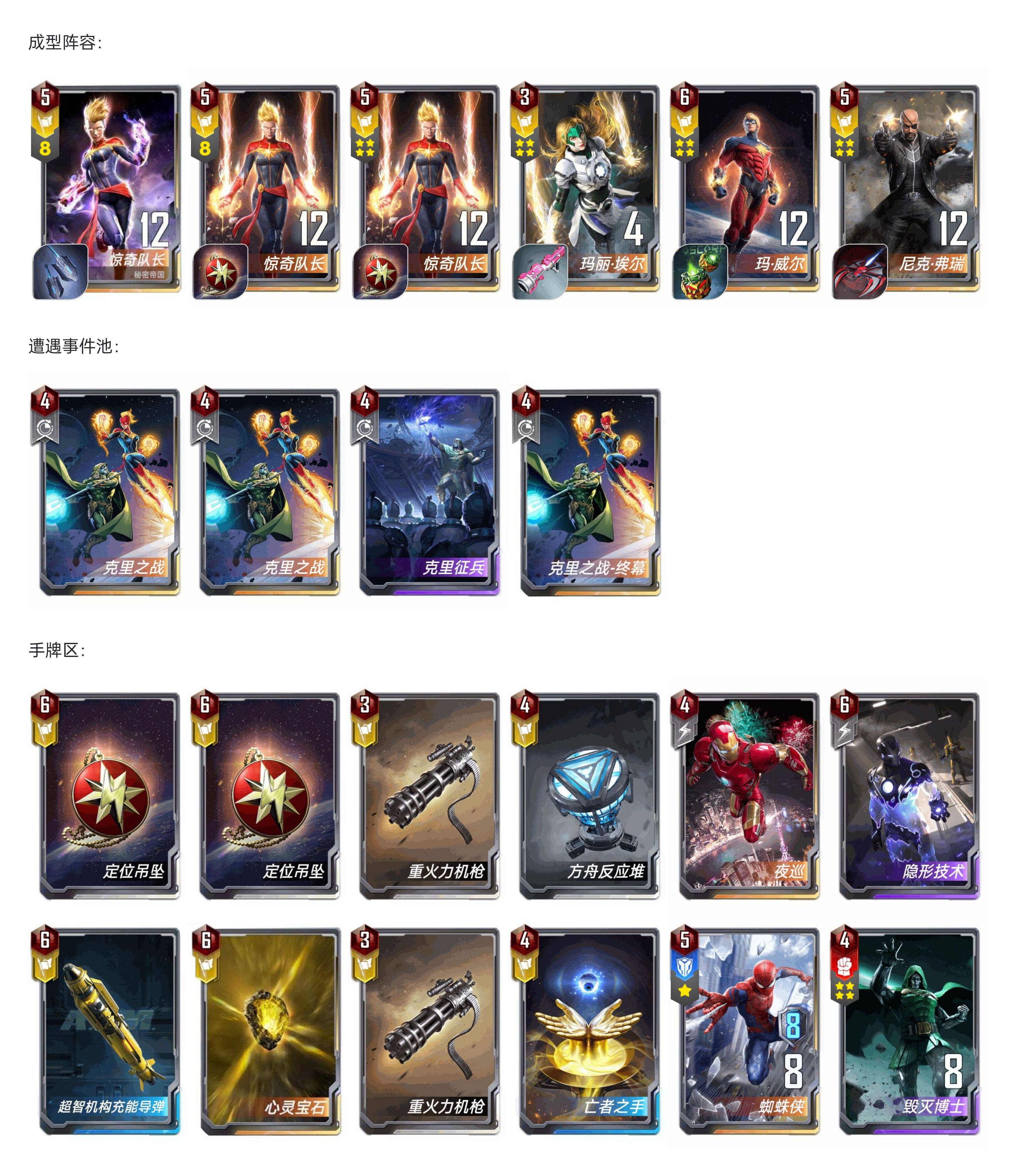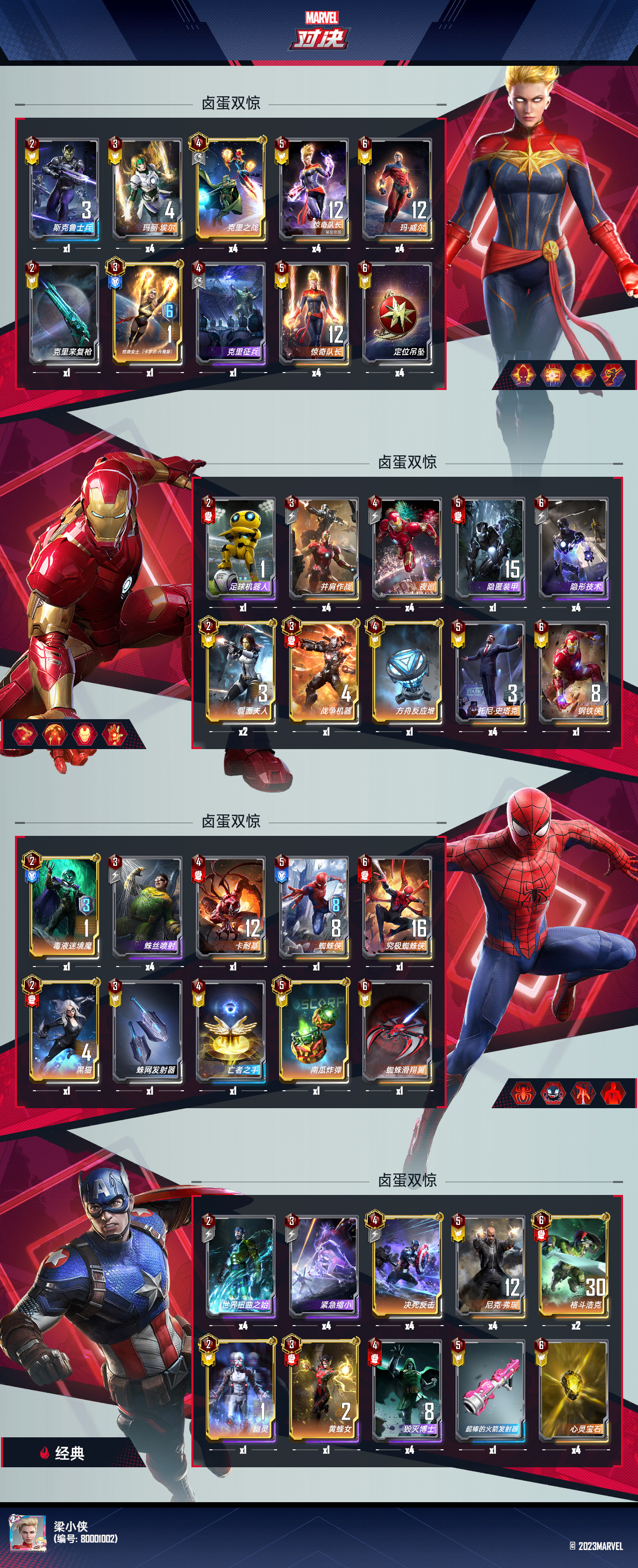 1,惊队卡组无非就是两种:红斗篷转双惊,或者传统的玛丽链接转双惊。带红斗篷过渡前期会更稳一点,而我带了蜘蛛侠就是想英雄责任翻玛丽前期比较强,有机会召唤很多高星角色来入死对面。两种带法根据需求自行选择。
