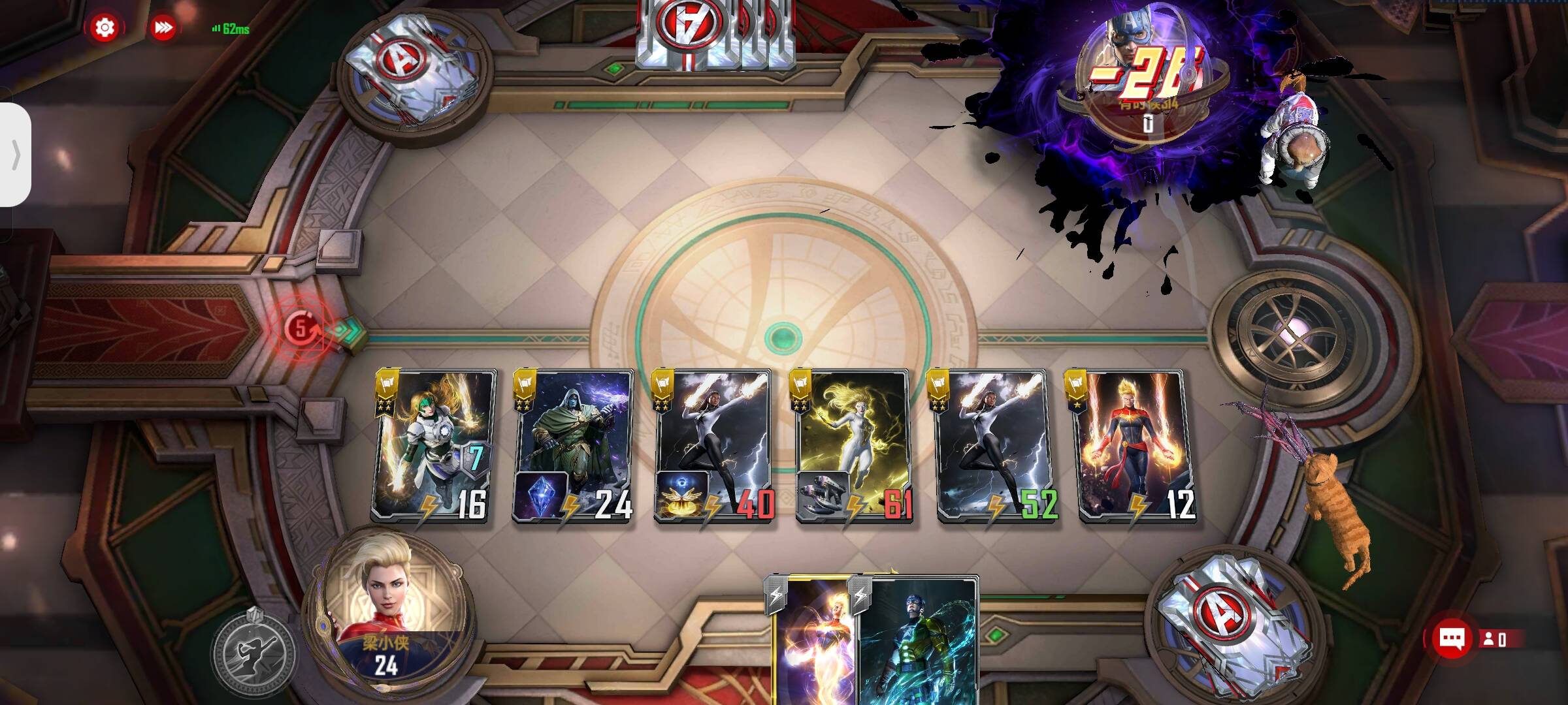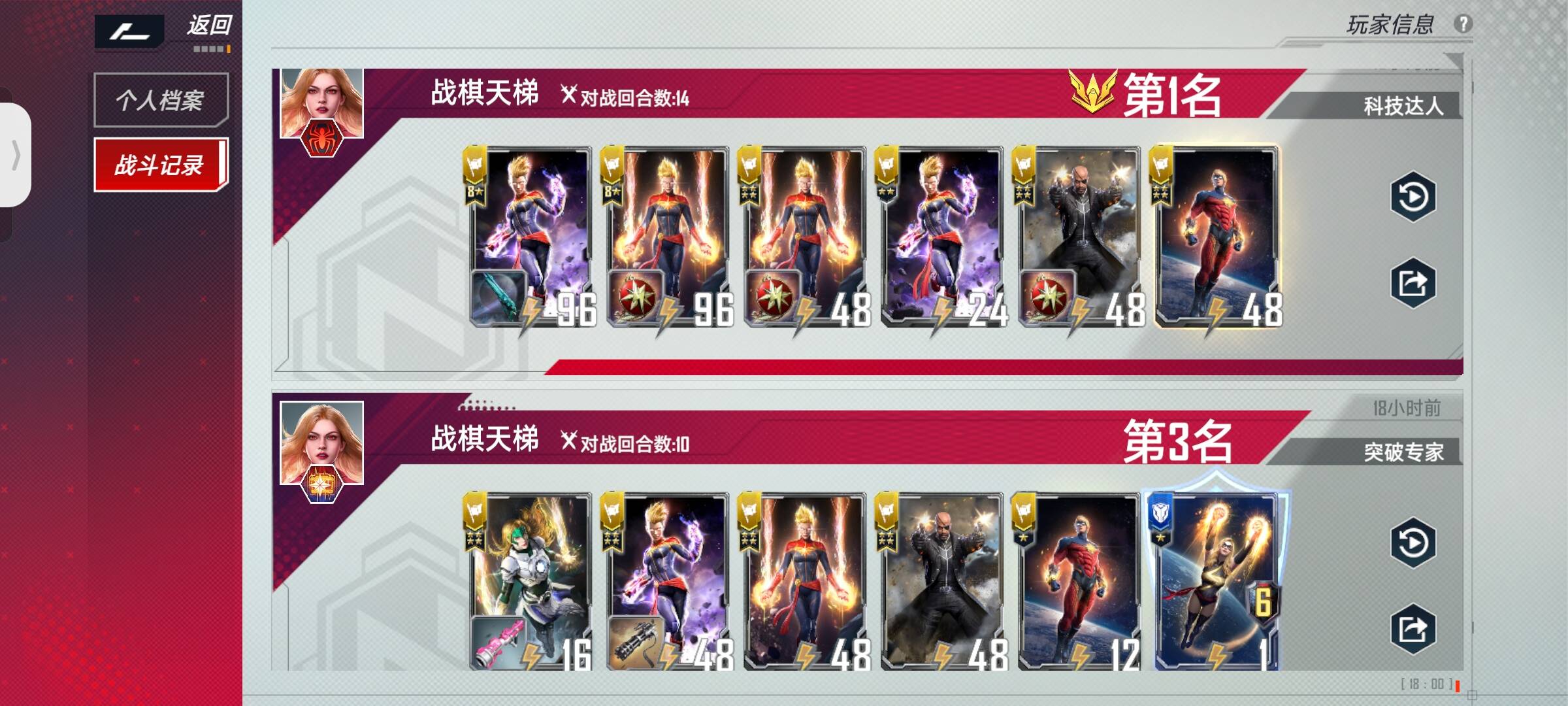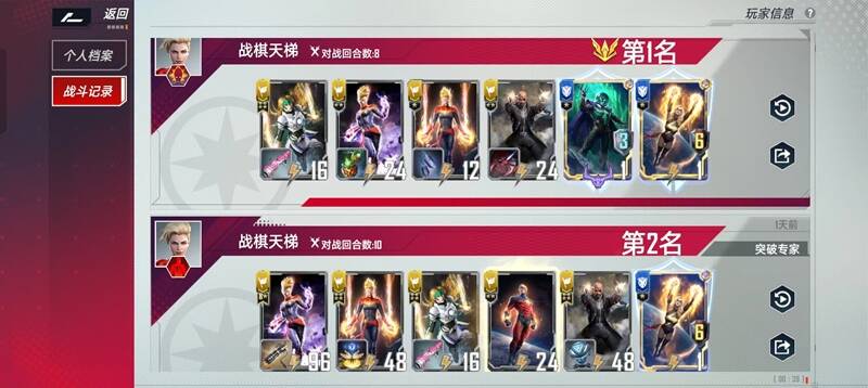 击败格斗法案例:我这局比较顺,连续3回合击败格斗浩克对手,其中第2回合还实现惊队连飞。而对面没有夜巡或合击,也没有毁灭博士。