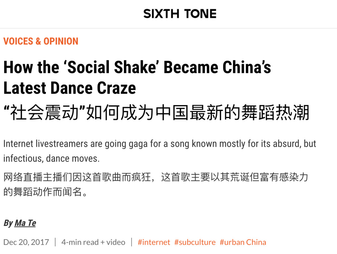 在当时,这种形式独特的舞蹈都是西方媒体津津乐道的话题,他们还根据中文翻译出了社会摇的英文:Social Shake ,把没接触过社会摇的外国老哥看的一愣一愣的。