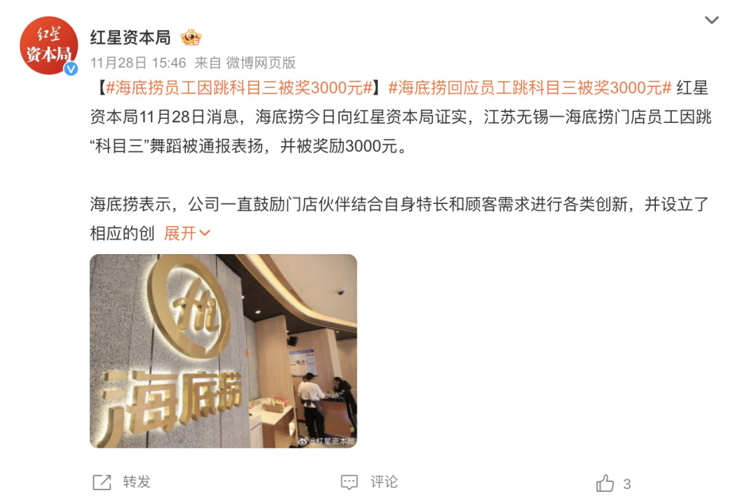 这不是在开玩笑, 11 月 28 日,海底捞证实江苏无锡一海底捞门店员工因跳 “ 科目三 ” 舞蹈被通报表扬,并被奖励 3000 元。