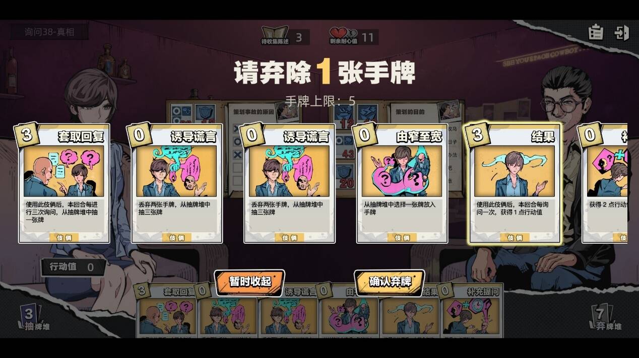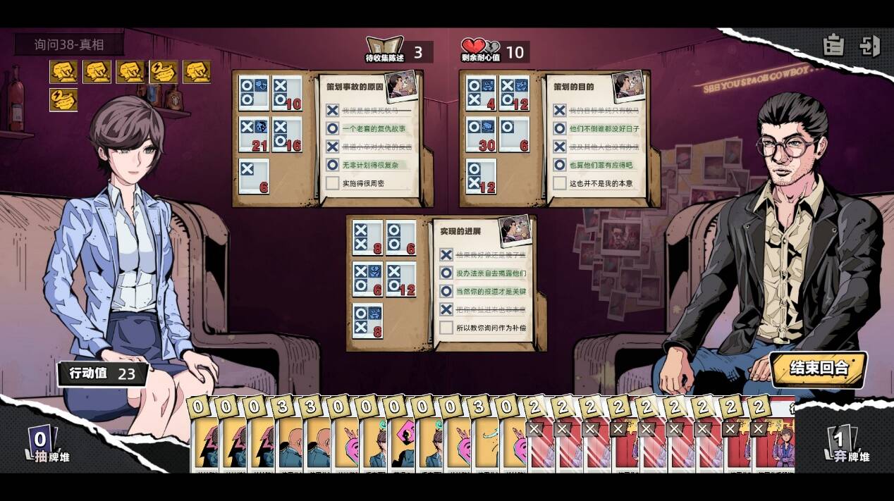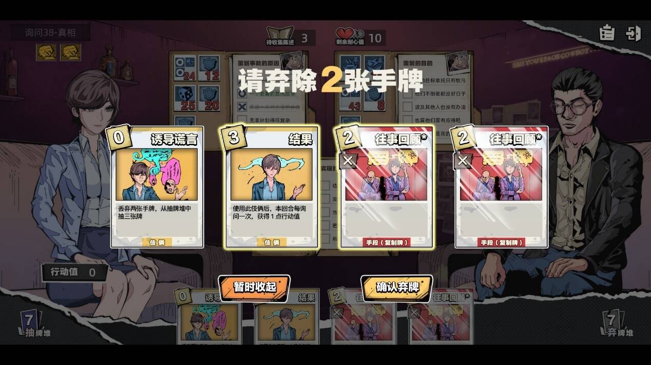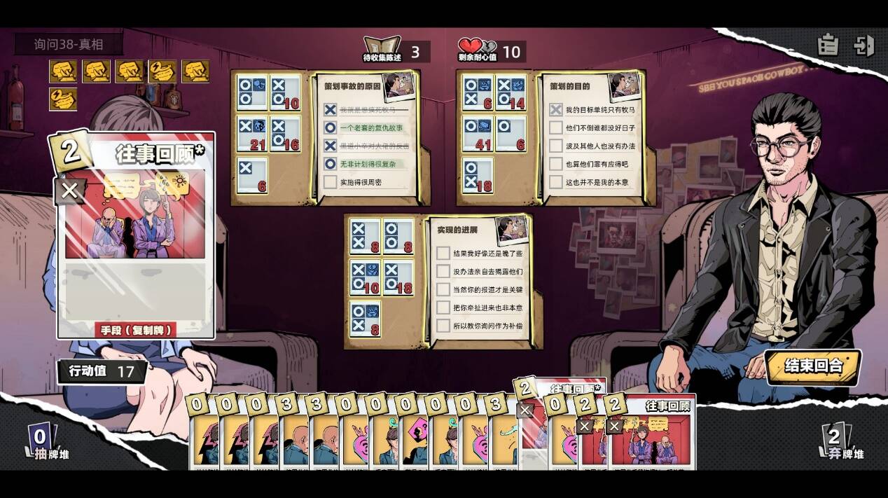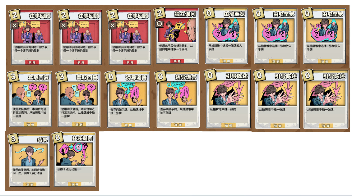 那么最后我实际组出的通关卡组其实是这样的。因为直接用询问莽穿过去实在太无聊了,也感觉不到侦探游戏那种悬疑的氛围,再加上只靠**回顾的刮痧伤害硬莽实在太墨迹了,所以自从组出这套完整构筑以来,我都是用分析的方法通关的直到关底boss。带了一张独立询问只是为了这张牌带的正确符号答题,没解锁的话哪怕换成主动靠近也可以。