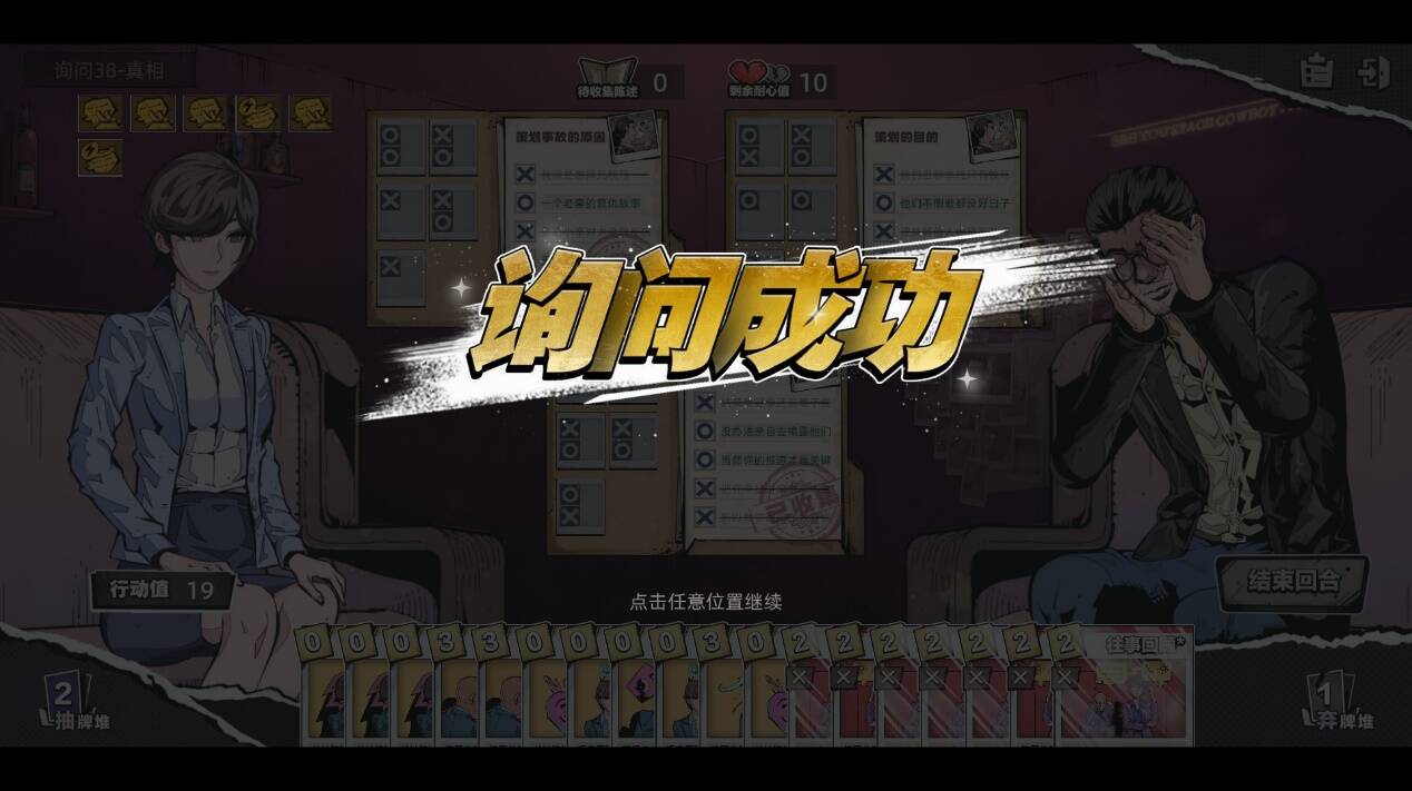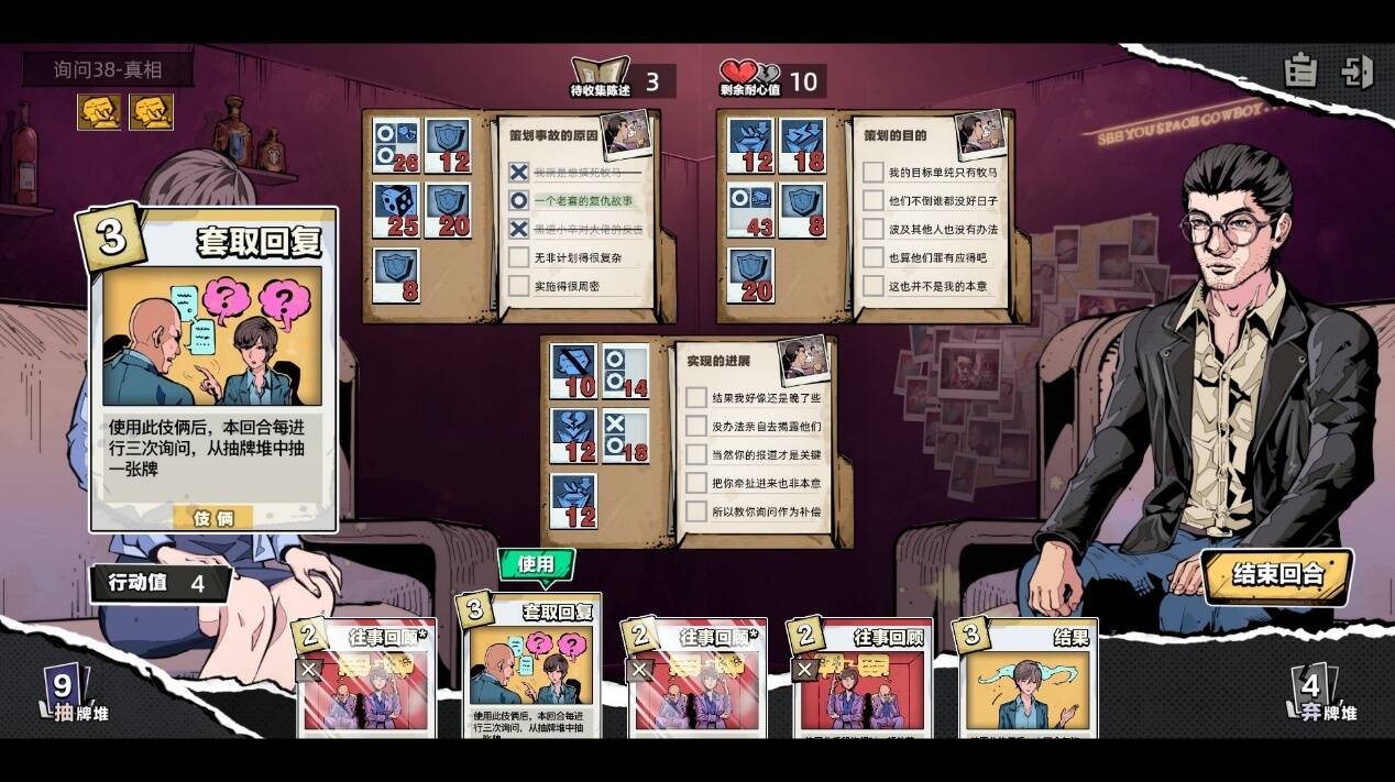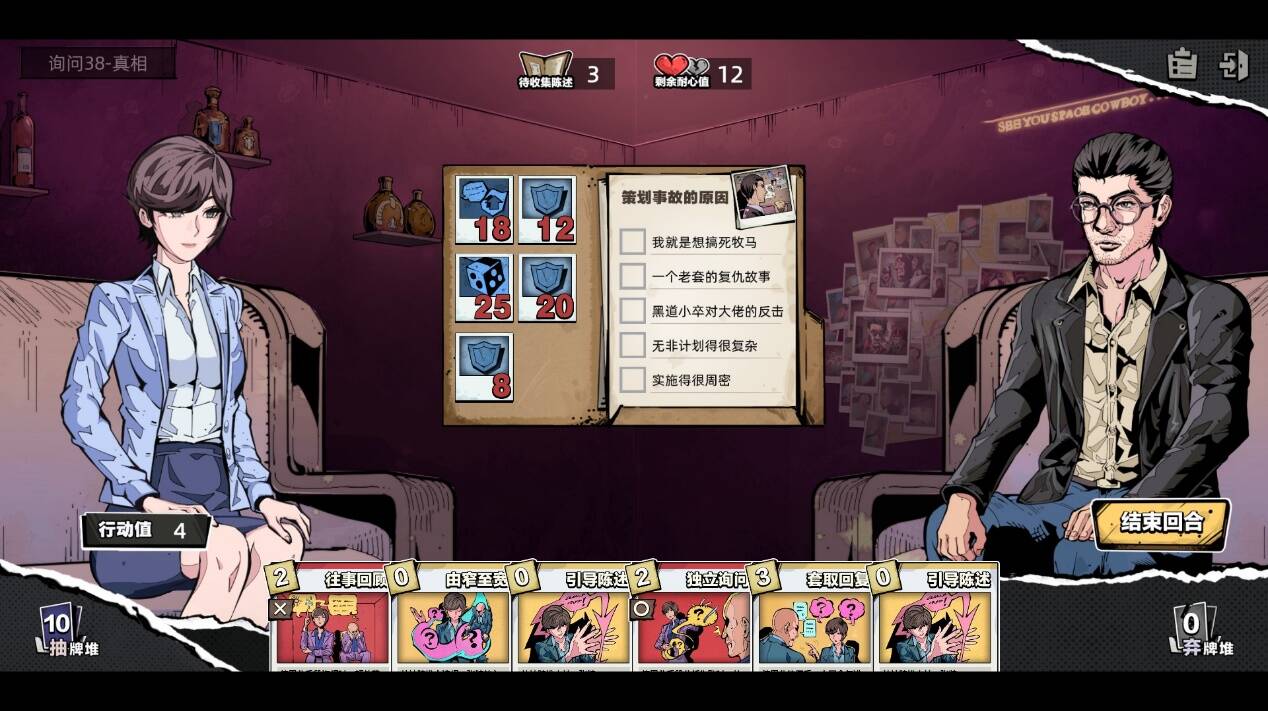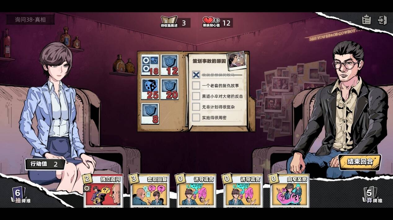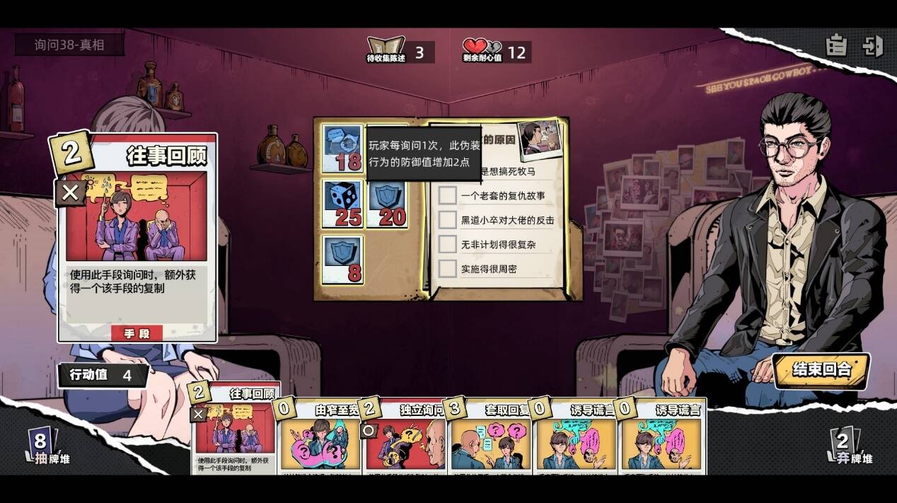 那么最后我实际组出的通关卡组其实是这样的。因为直接用询问莽穿过去实在太无聊了,也感觉不到侦探游戏那种悬疑的氛围,再加上只靠**回顾的刮痧伤害硬莽实在太墨迹了,所以自从组出这套完整构筑以来,我都是用分析的方法通关的直到关底boss。带了一张独立询问只是为了这张牌带的正确符号答题,没解锁的话哪怕换成主动靠近也可以。