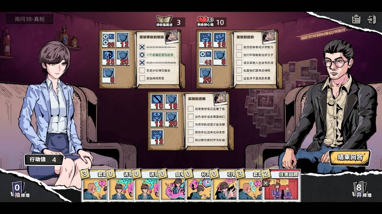 首先,这个游戏做的比较好的地方是选择题材我很喜欢,卡牌加侦探的组合这对于我来说是完全没有抵抗力的。昨天哪怕是早在半年前就被剧透过的柯南剧场版我还是去看了,所以这个游戏在一开始确实就很吸引我。游戏机制虽然算不上新颖,但是能用分析判断嫌疑人说说实话还是假话这一点还是非常创新的,整个游戏的美术风格我也非常喜欢,有种回到了高中时代上贴吧看蜘蛛侠漫画的感觉,真的氛围感塑造的相当不错。